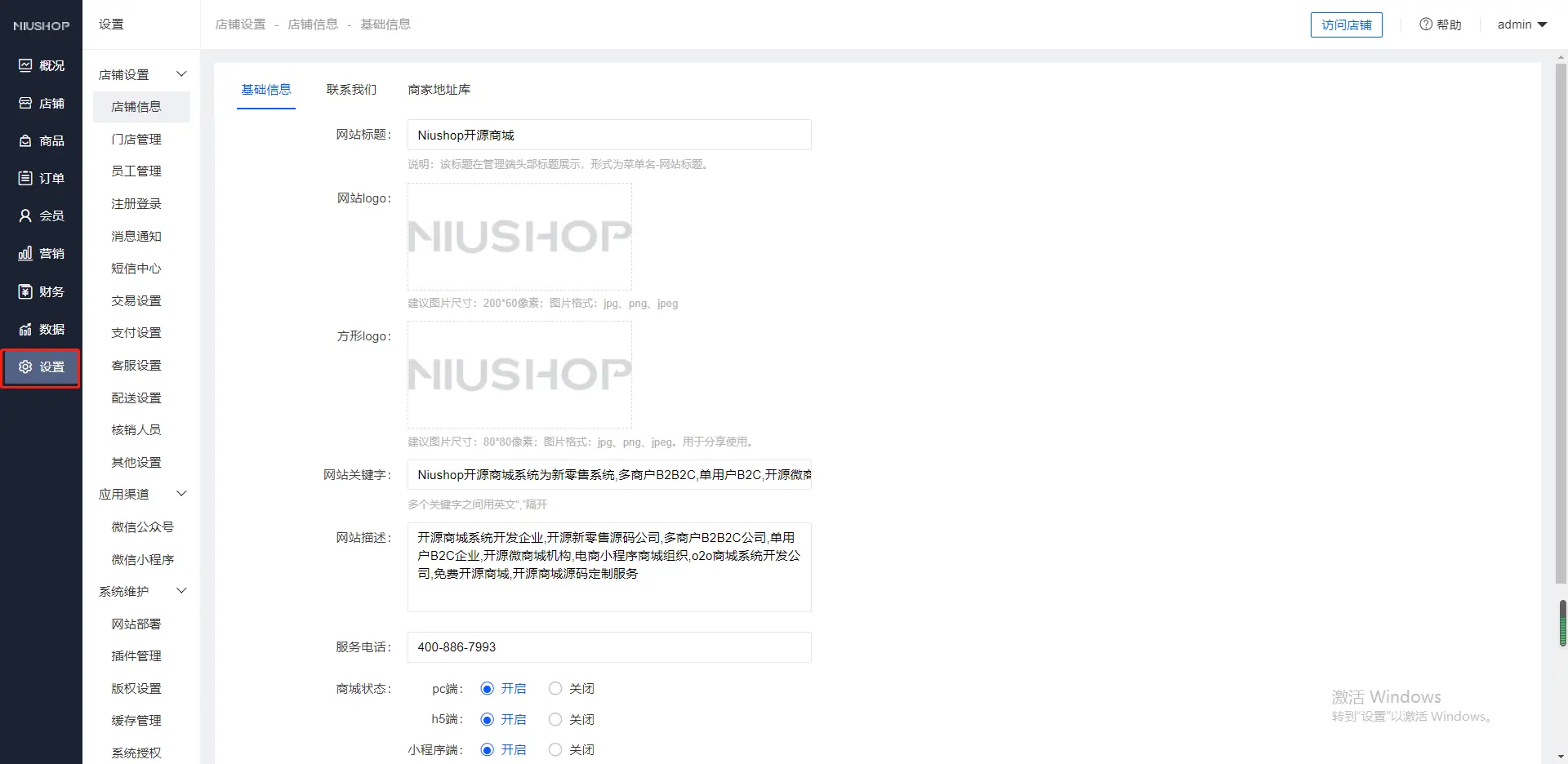 1.后台-设置-店铺设置-基础信息设置,可设置网站标题、logo、关键字描述和电话状态等