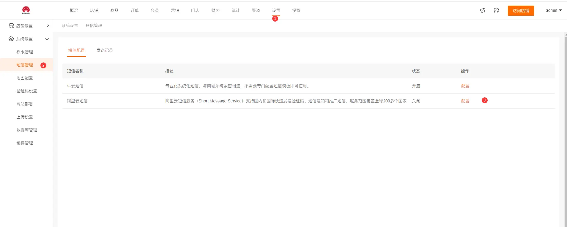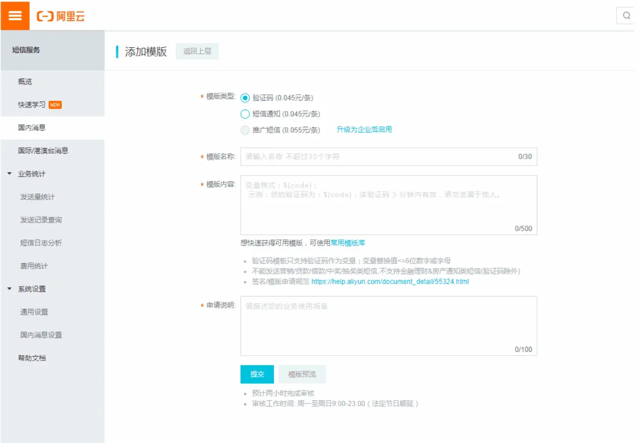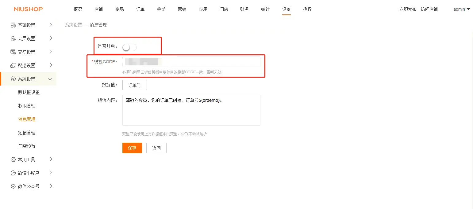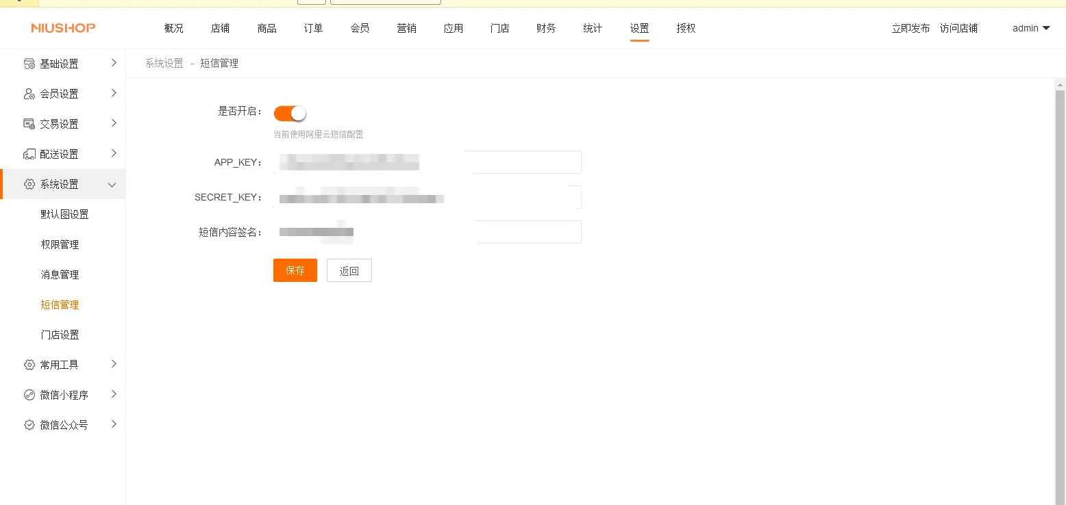 登录商城后台端找到 设置--系统设置--短信管理 在阿里云的找到AccessKey ID 和AccessKey Secret填写到后台 在阿里云的找到签名名称填写到后台 根据平台端提供的模板内容在阿里云申请模板 申请好模板之后。对应的模板code填写到后台的对应的模板中