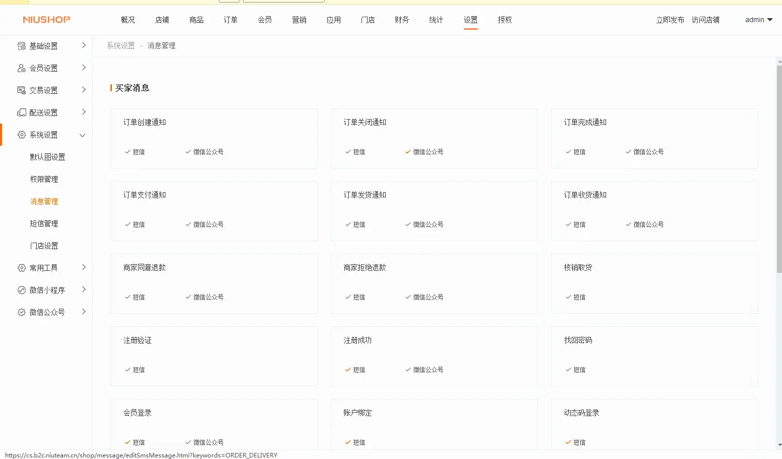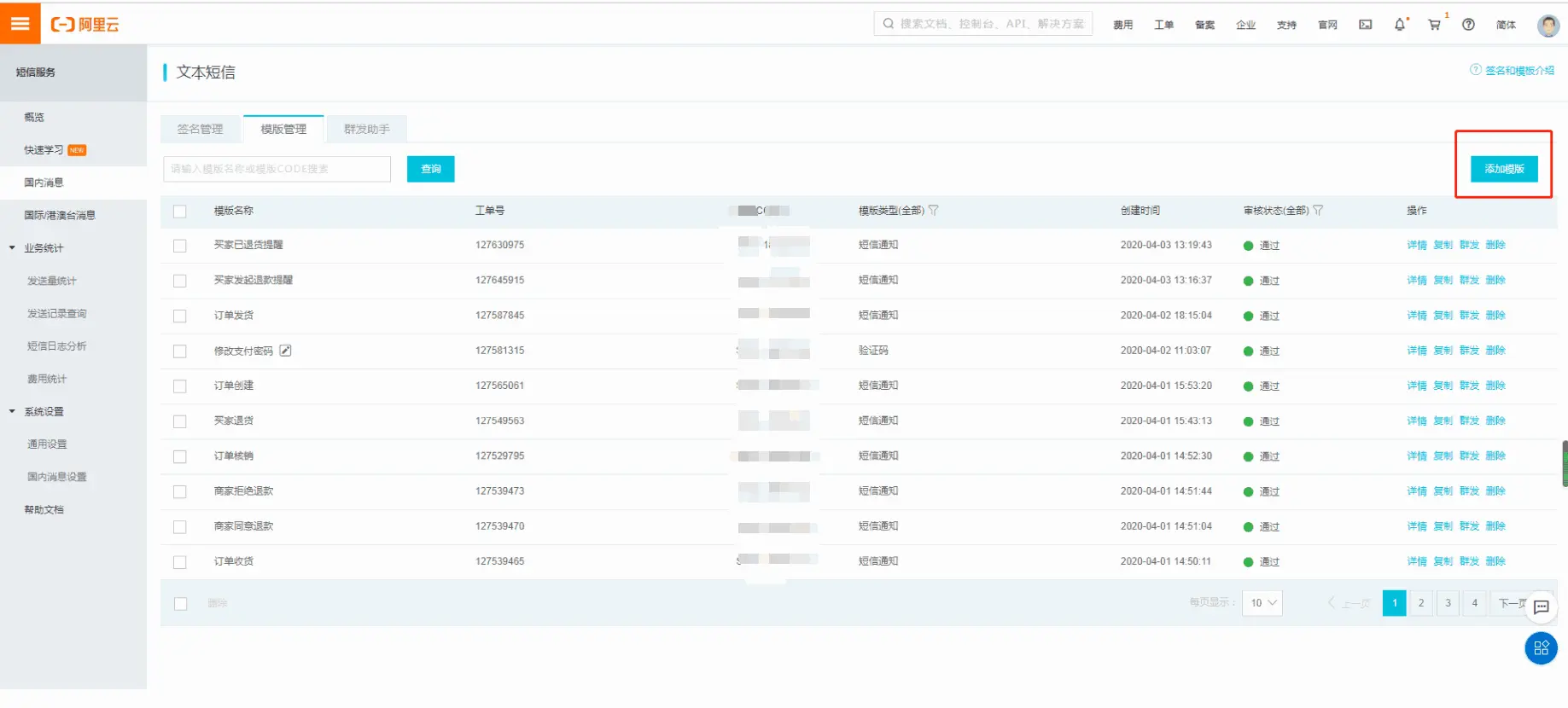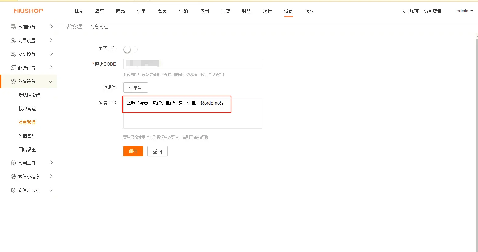 登录商城后台端找到 设置--系统设置--短信管理 在阿里云的找到AccessKey ID 和AccessKey Secret填写到后台 在阿里云的找到签名名称填写到后台 根据平台端提供的模板内容在阿里云申请模板 申请好模板之后。对应的模板code填写到后台的对应的模板中