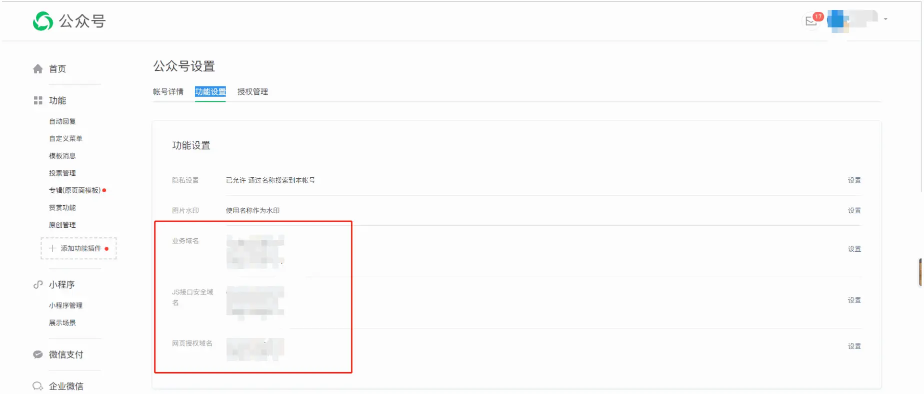 第十步:如果需要在微信公众号中拿单独域名访问 请把此域名配置到微信公众号的业务域名、js域名、网页域名即可
