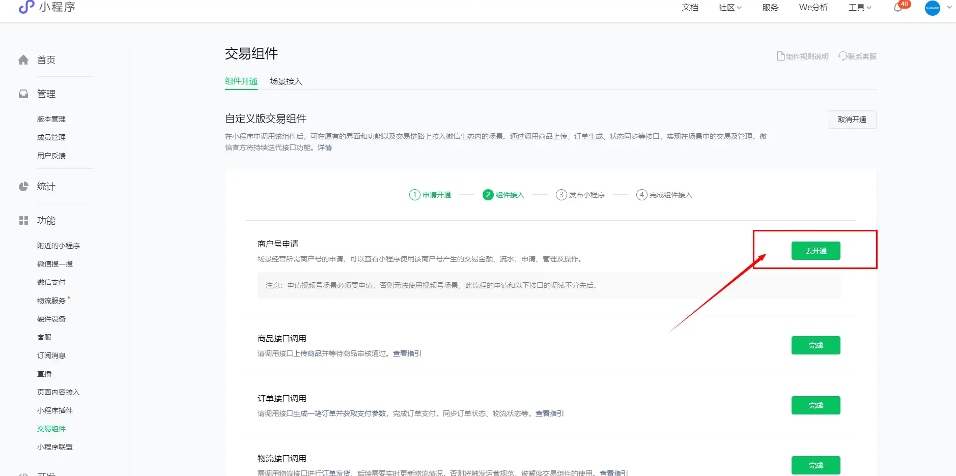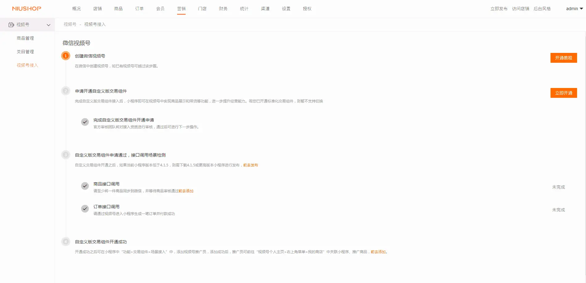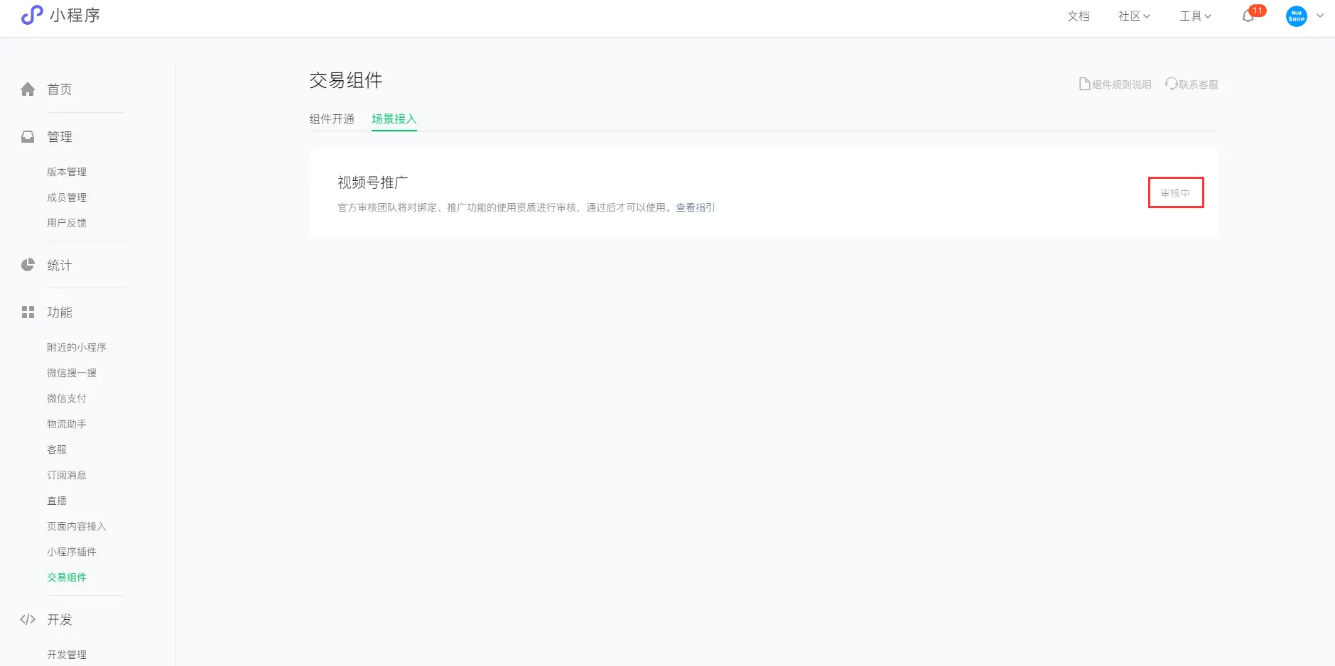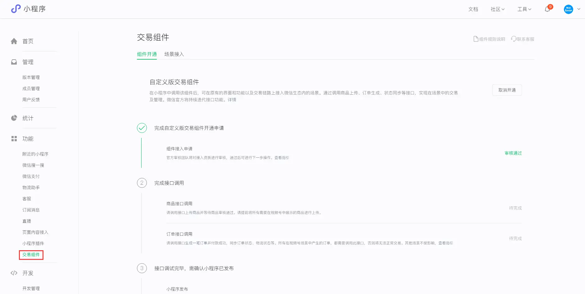 当审核通过后,商城后台视频号交易组件就会显示已开通,同时微信小程序端的功能模块下就会出现交易组件这个菜单,如下显示: