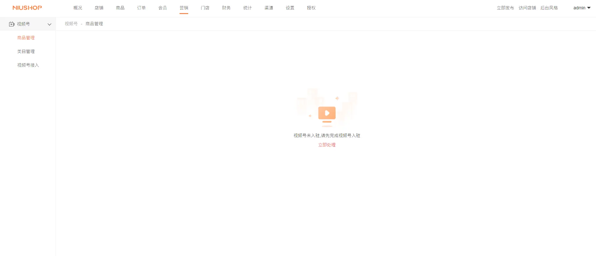 二、视频号未入驻,会先提示进行视频号的入驻以及自定义交易组件的开通,点击立即处理。如下所示界面: