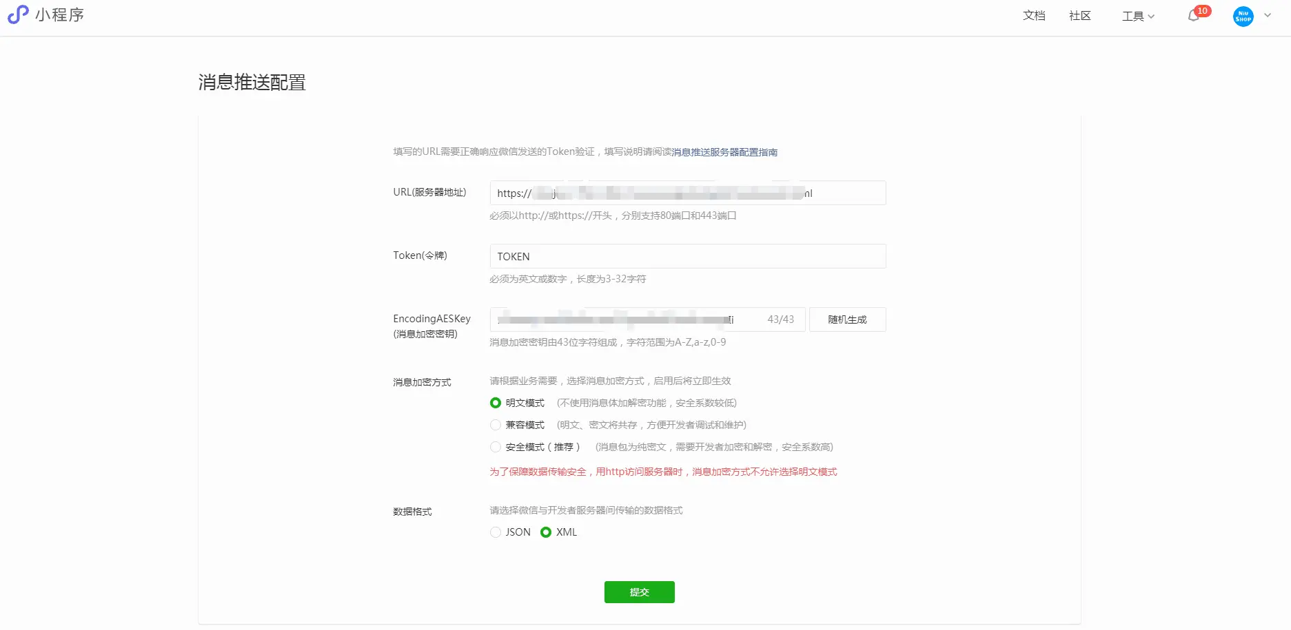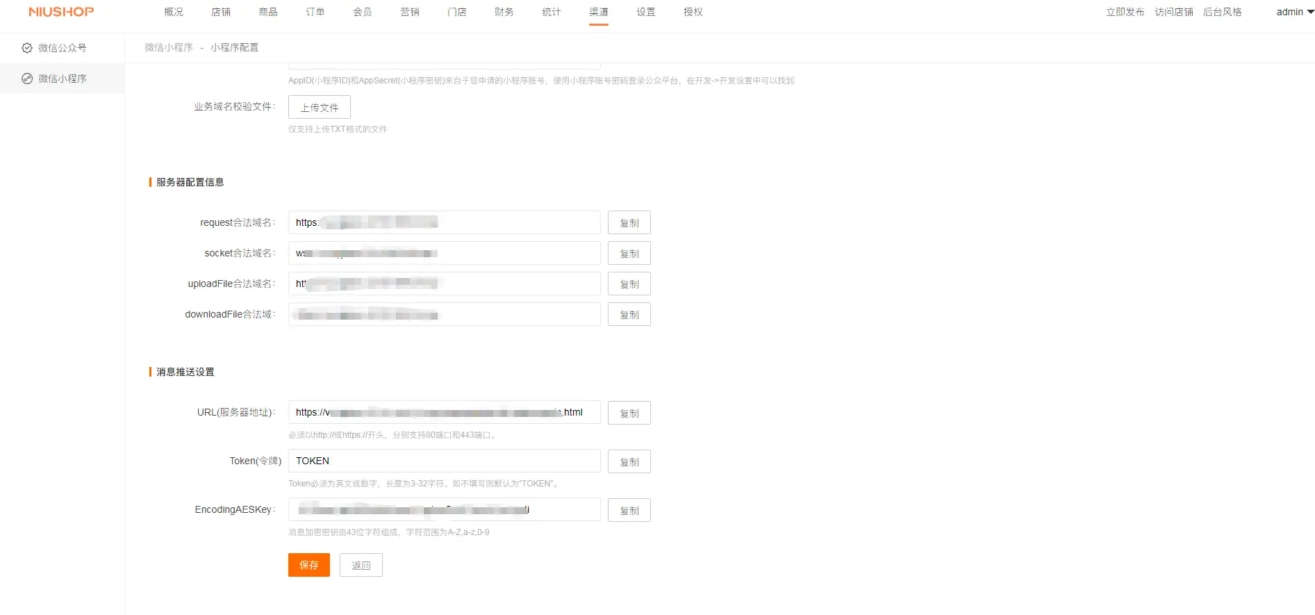 将商城后台小程序消息推送配置复制到小程序配置下(注意必须是https的协议才可以),具体操作后保存: