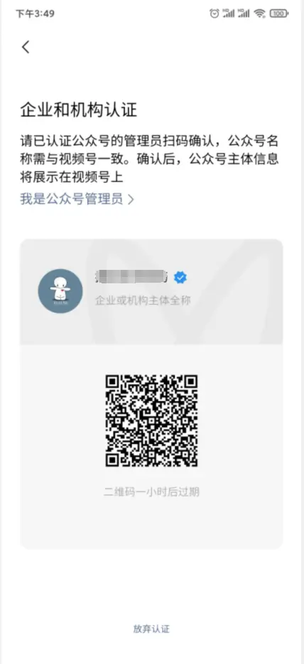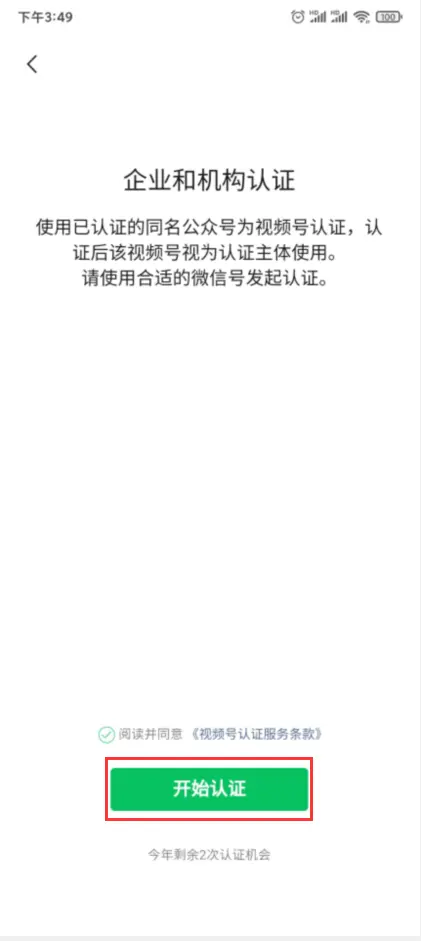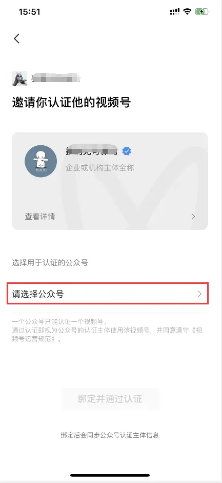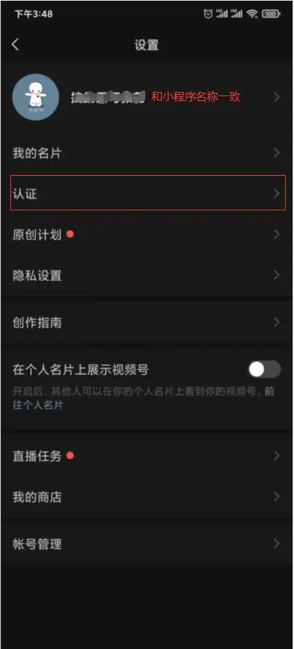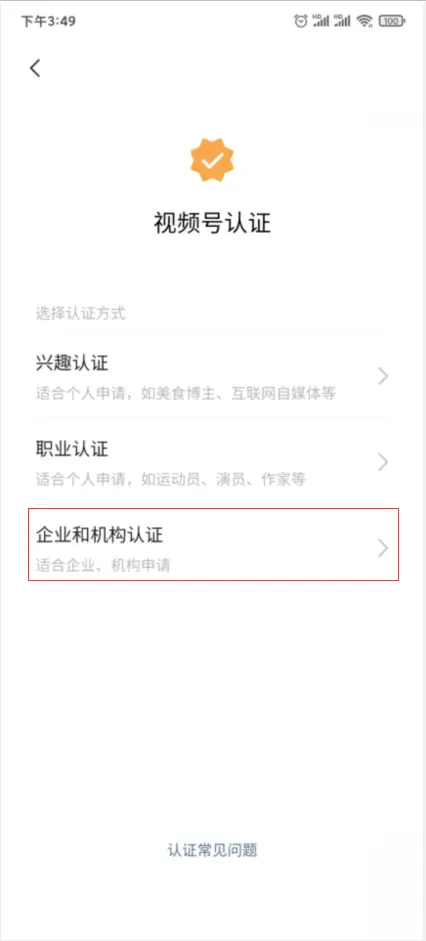 5、最后一步需要完成订单接口调用,在订单接口调用之前需要先将视频号进行认证,视频号名称必须和小程序名称一致才可通过审核。如提前已认证过,那么该步骤可以忽略。如下操作步骤(以企业机构认证为例):