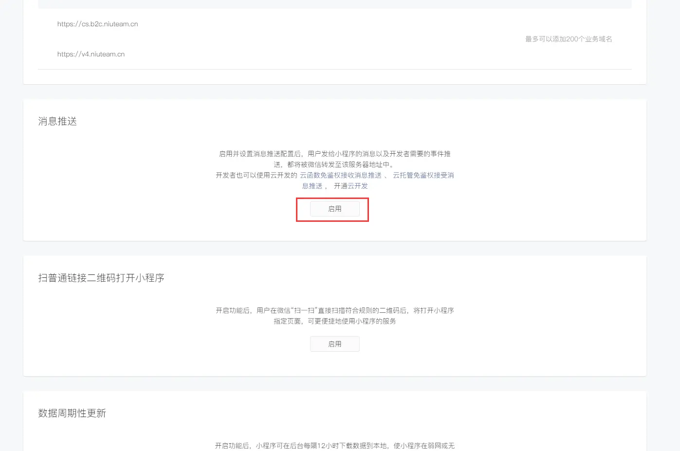 3、微信小程序端后台需配置消息通知,用以接收类目和商品的审核结果推送(开发-开发管理-开发设置-消息推送)