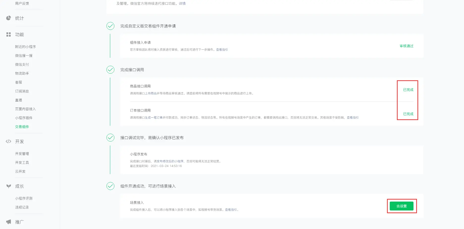 最后再对订单进行发货操作及退款操作,所有操作完成后在小程序交易组件-组件开通中会全部显示已完成