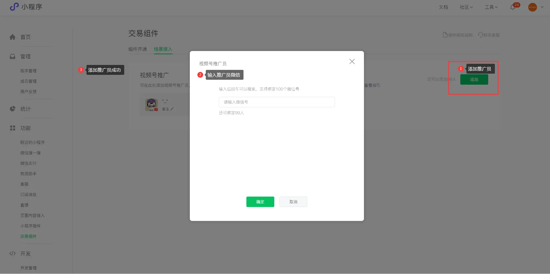 最后在小程序平台端点击场景接入,在视频号推广中添加关联推广员