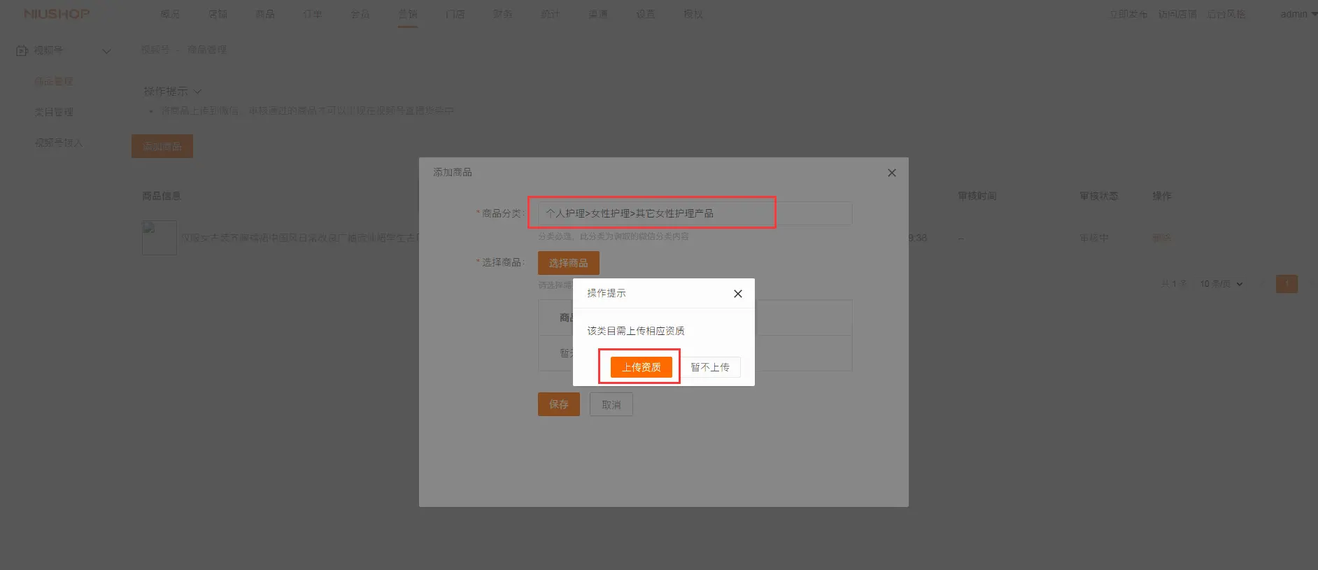 如果上传的商品所在的分类需要上传资质,那么需要进行资质上传审核操作,否则直接添加等待审核结果就可以。如下: