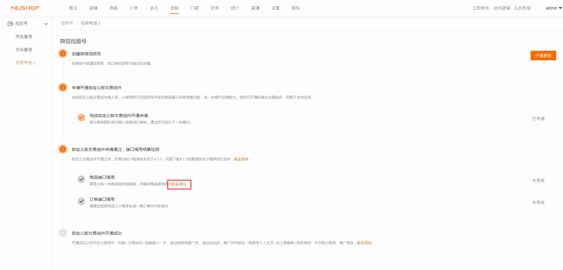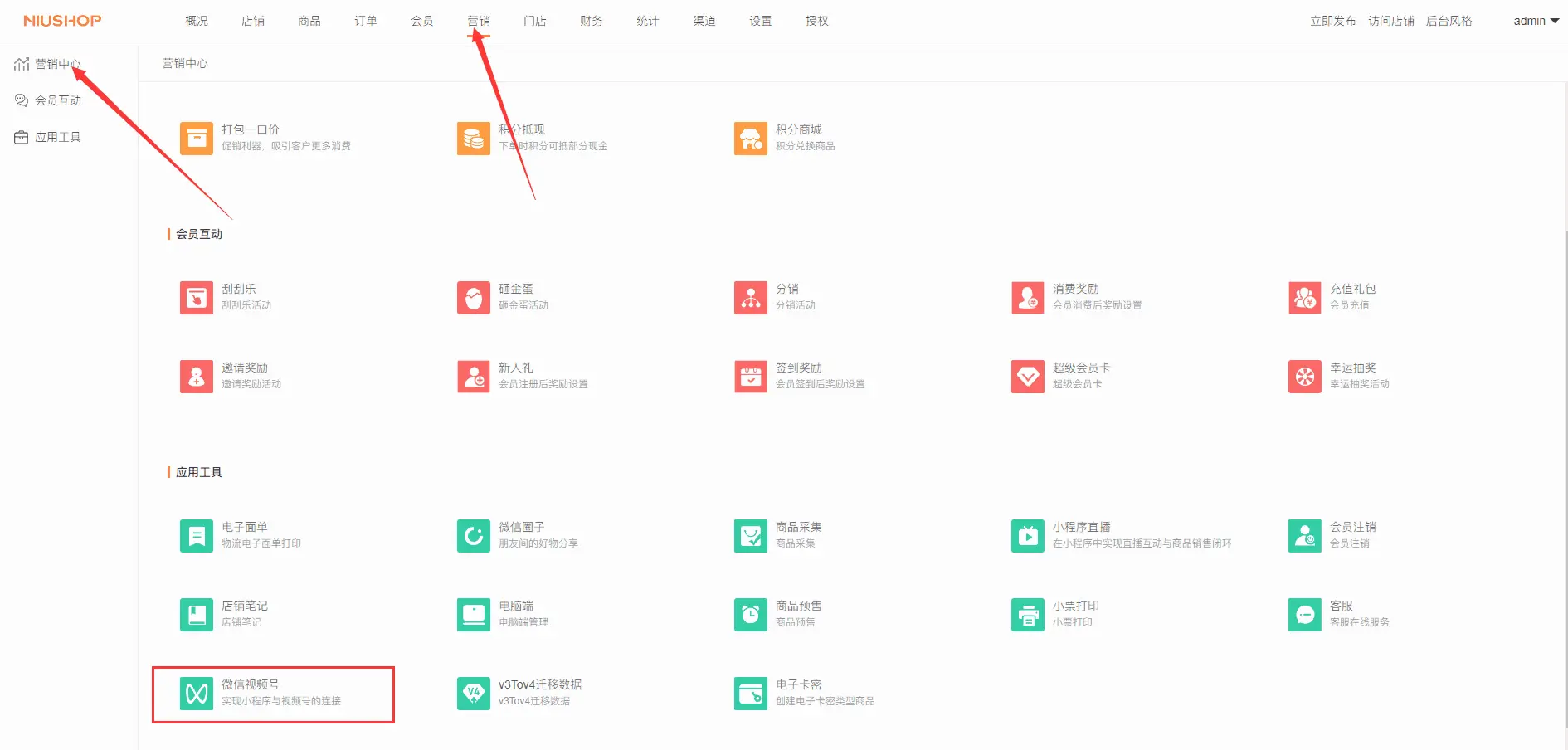 一、登录商城后台,点击营销,找到微信视频号插件,点击进入,如下所示: