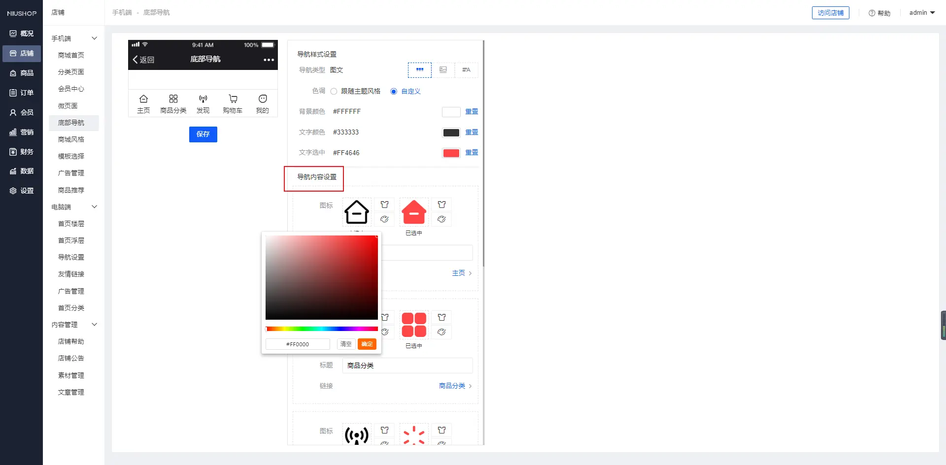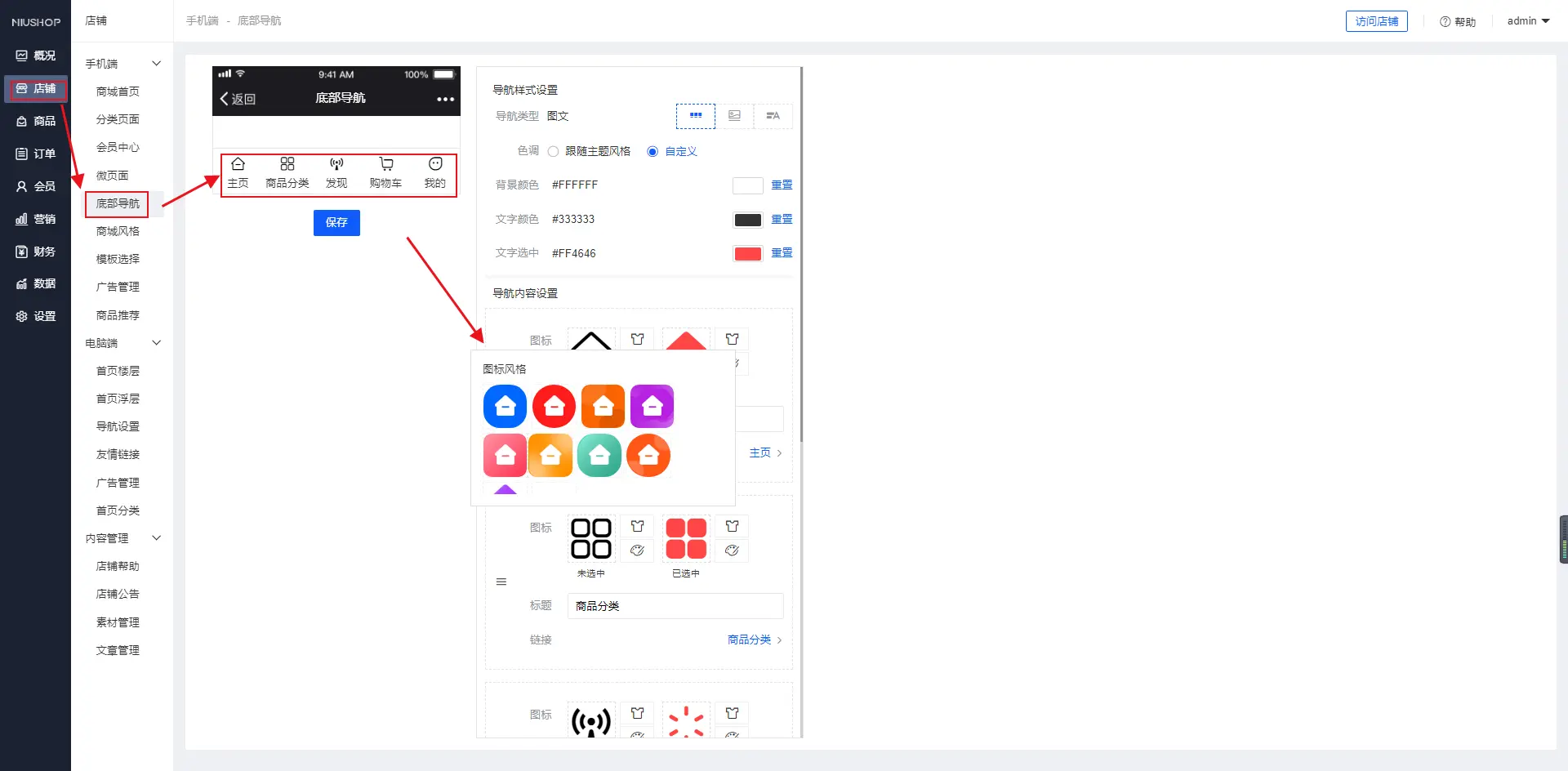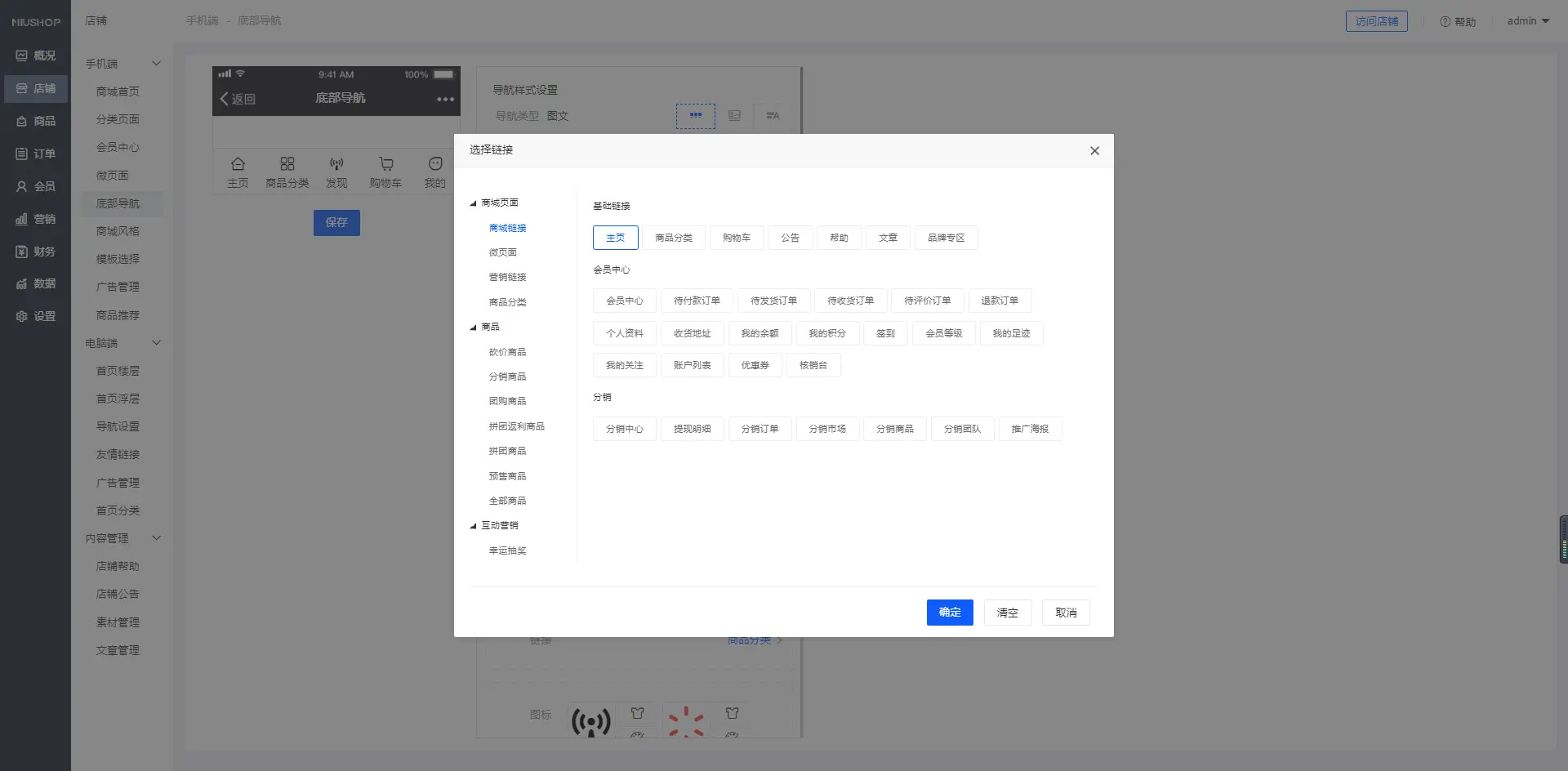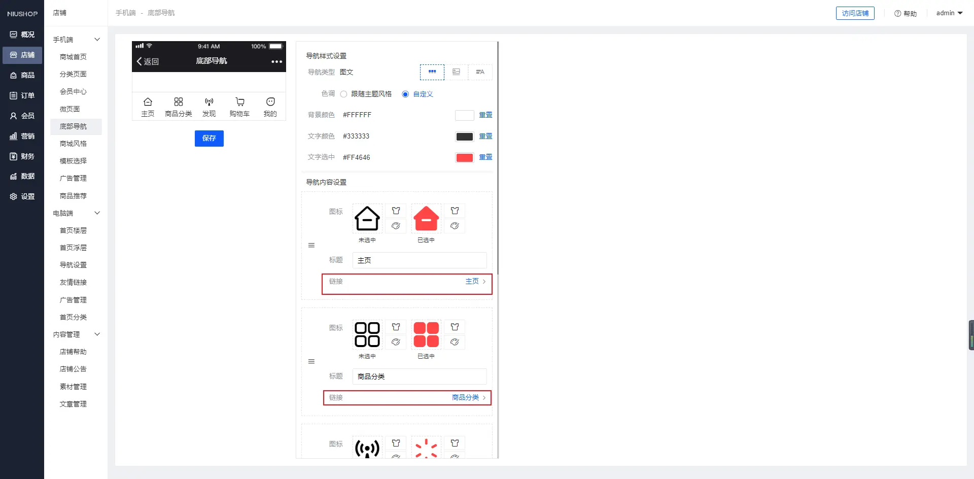 一、功能介绍 单商户系统可以编辑属于自己的底部导航信息,使用图片或用户合成图标,不懂美工的您也可以做出漂亮的页面元素二、操作说明 1.可以根据自身需求来变更所需要的底部导航样式,如下图: 2.在您选择图文,图片后可以自定义导航的图片,如下图: 3.可以自定义选择跳转到那个页面,自定义选择链接,如下图: