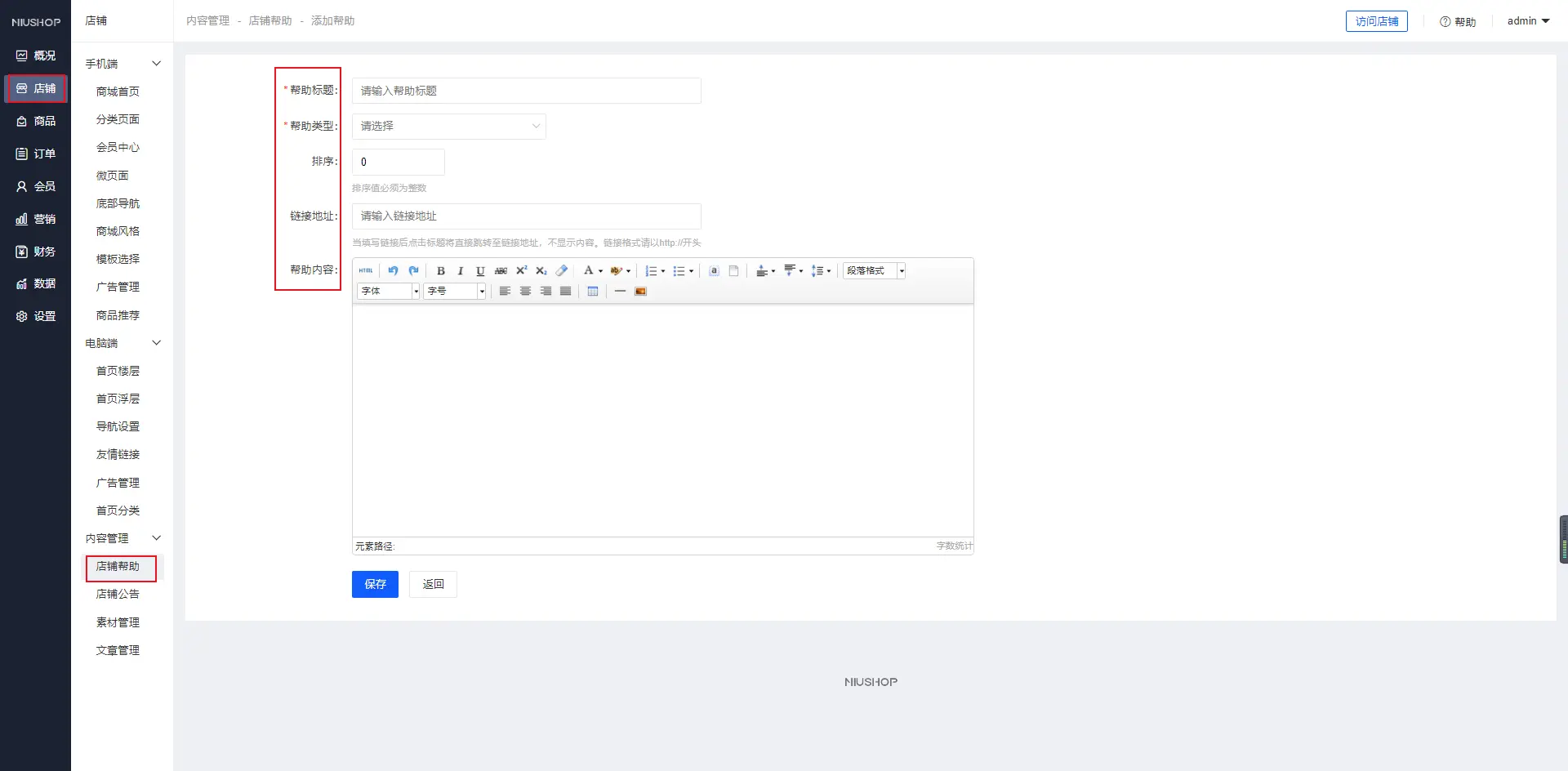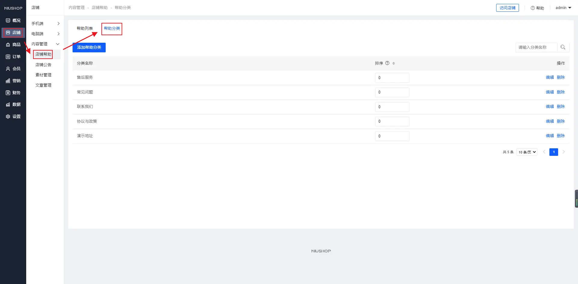 一、功能介绍 单商户系统,店铺帮助是为了让会员更好的使用店铺商城。为客户节省更多的时间二、操作说明 在添加具体的帮助前是需要添加店铺帮助分组的,针对每条不同的帮助信息归类到不同的分组里边,如下图: 添加分类之后添加帮助内容