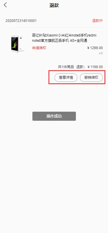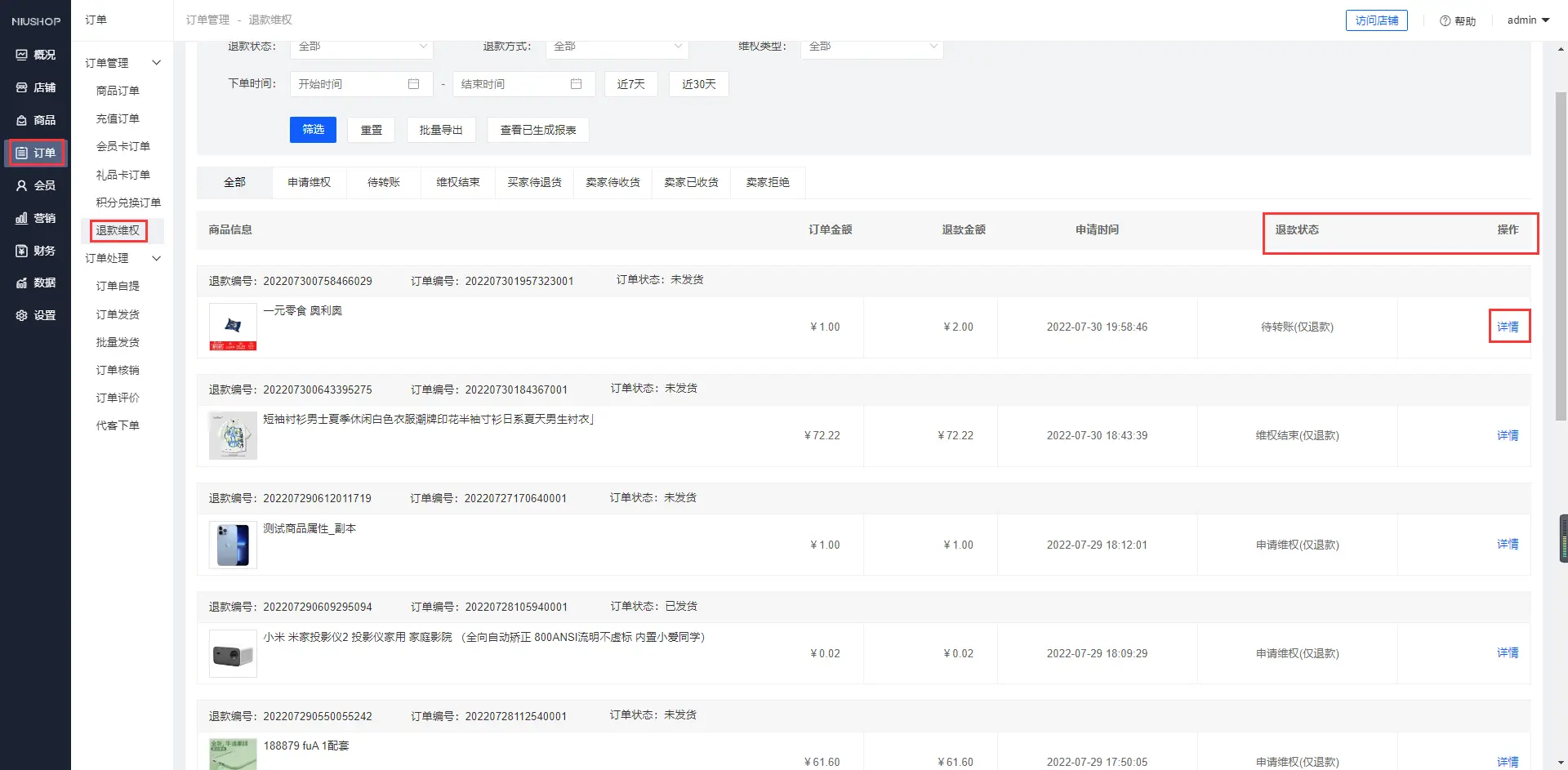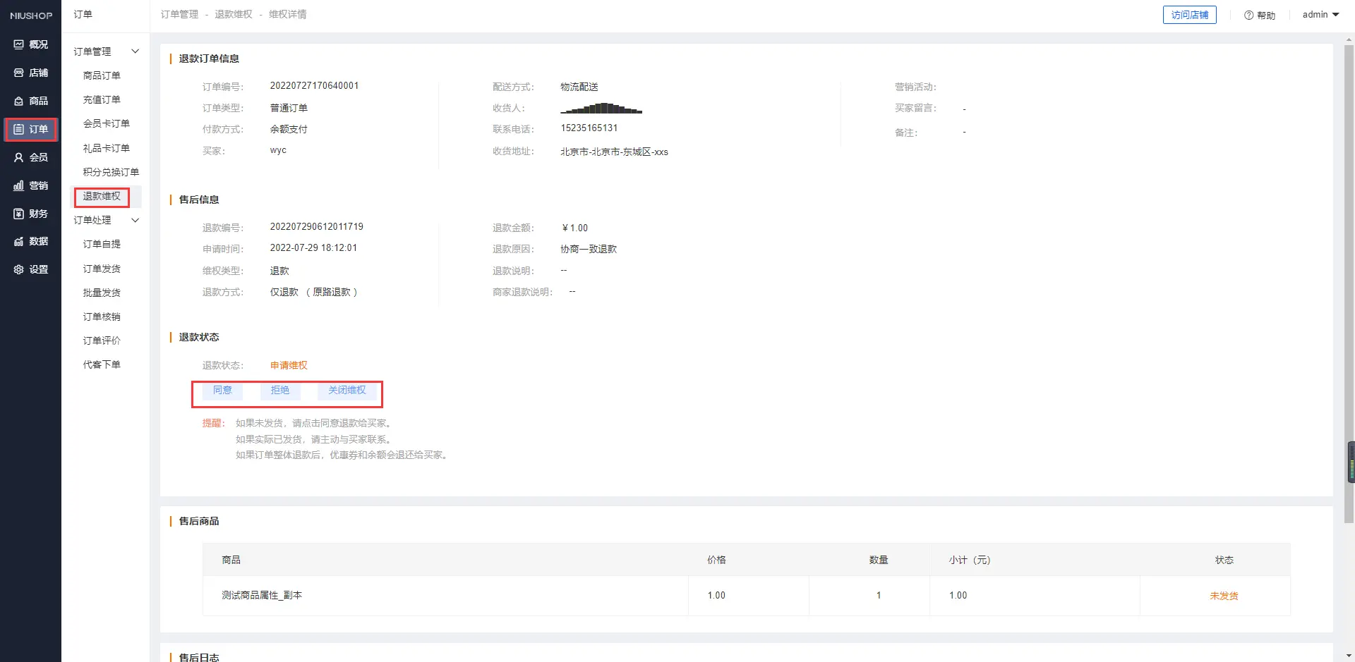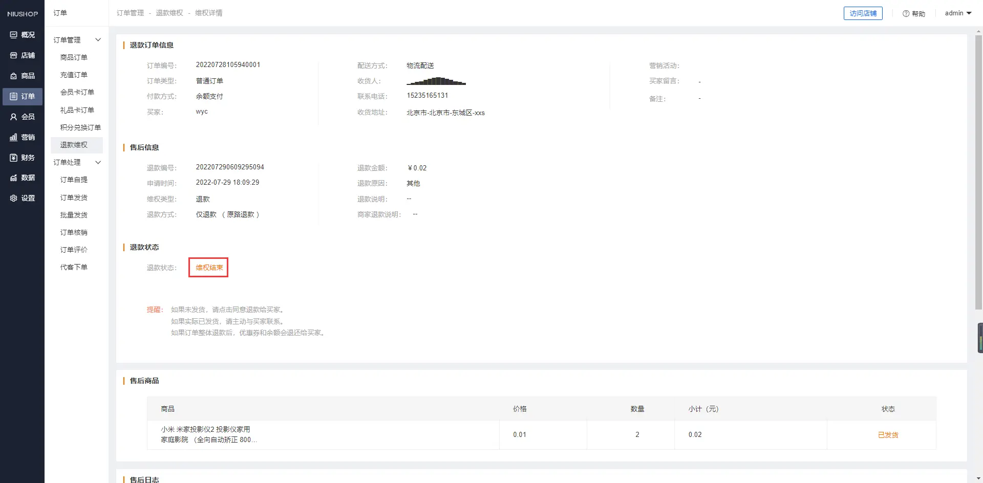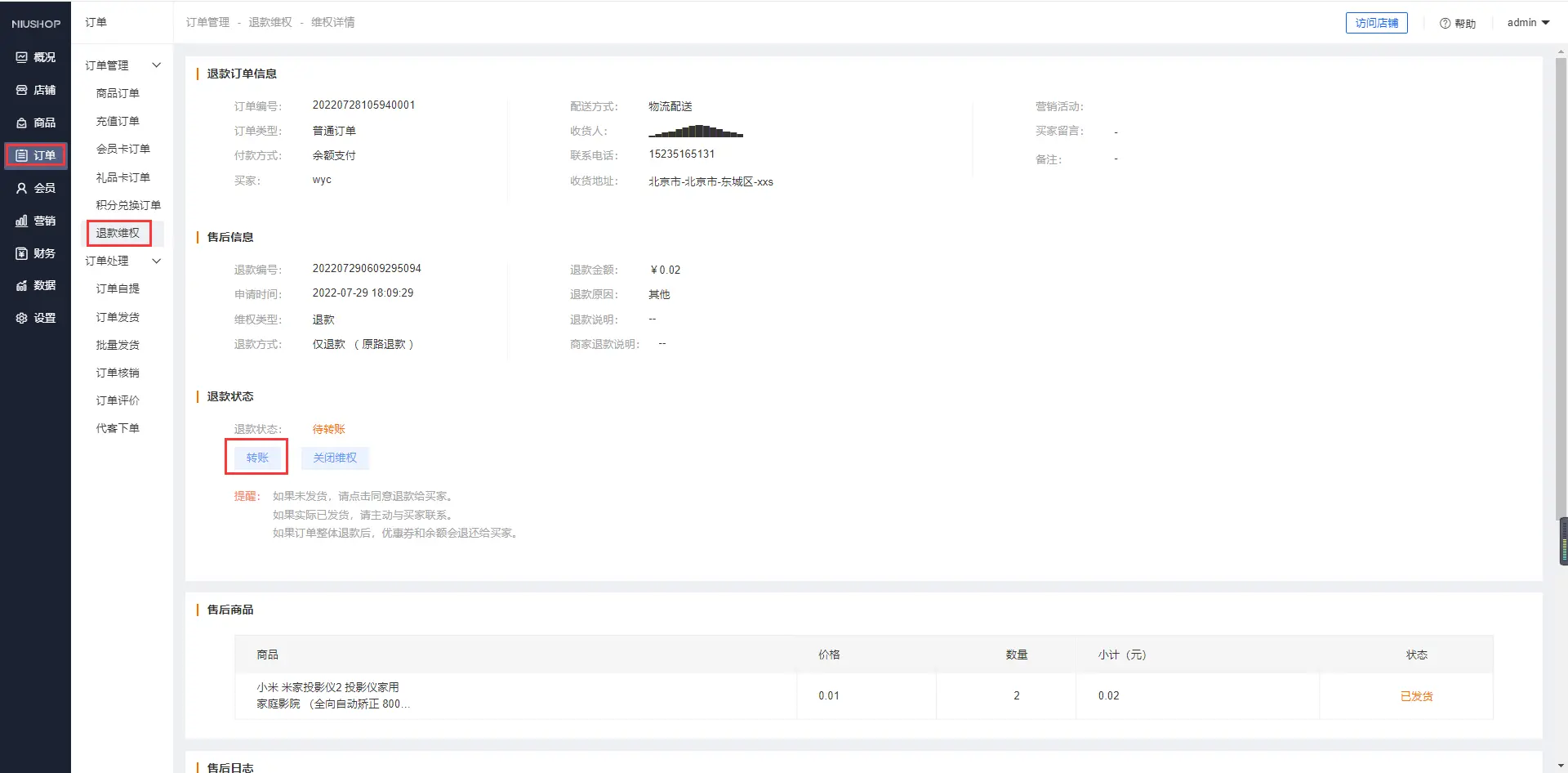 一、功能介绍 单商户系统,退款维权,客户在购买商品后在未完成订单的情况先可以进行退款维权,商家会在1-3个工作日进行退款。 二、操作流程 客户发起退款,客户也可以撤销维权与查看维权详情 在客户发起后,后台会接受到退款信息,点击查看详情可以进行同意或者拒绝操作 在商家拒绝维权操作之后(拒绝必须有拒绝的理由哦) 商家同意之后可以进行转账(转账之后会以支付方式原路返回到客户的账户)