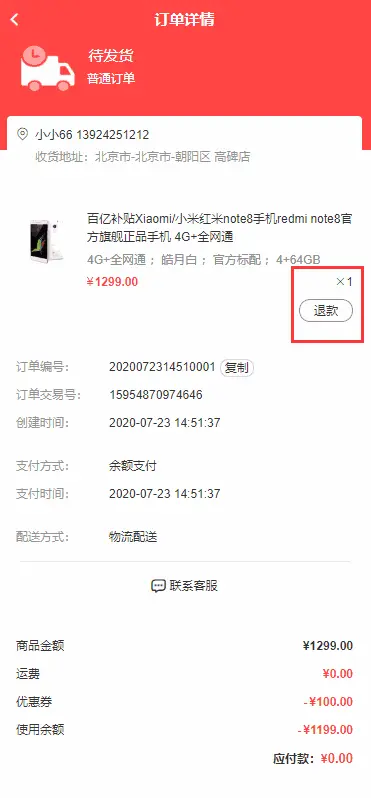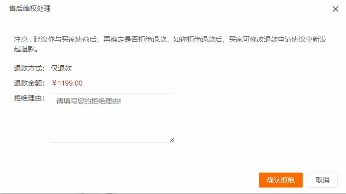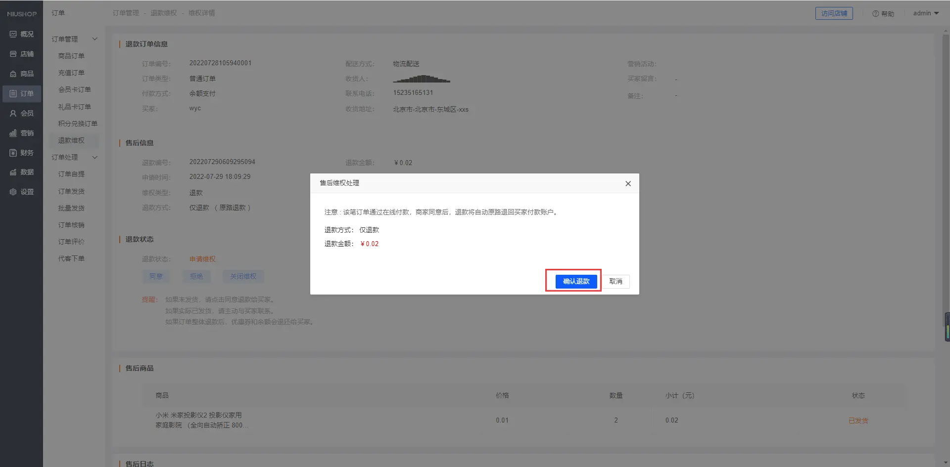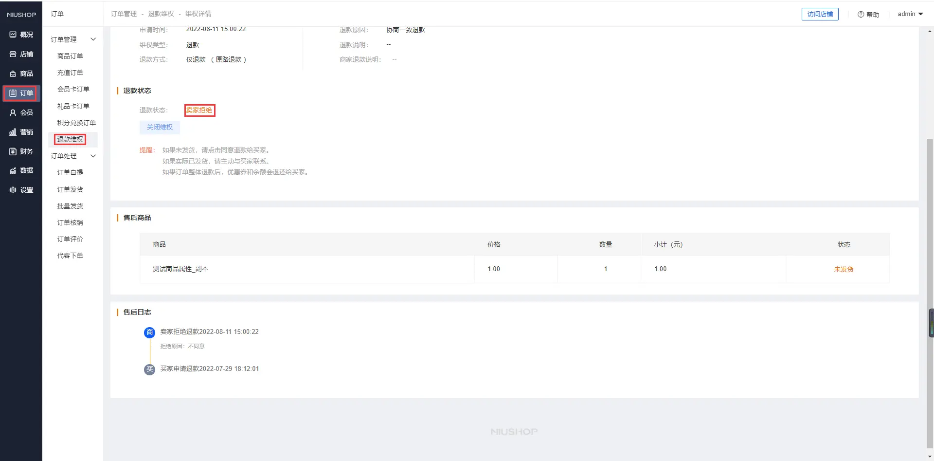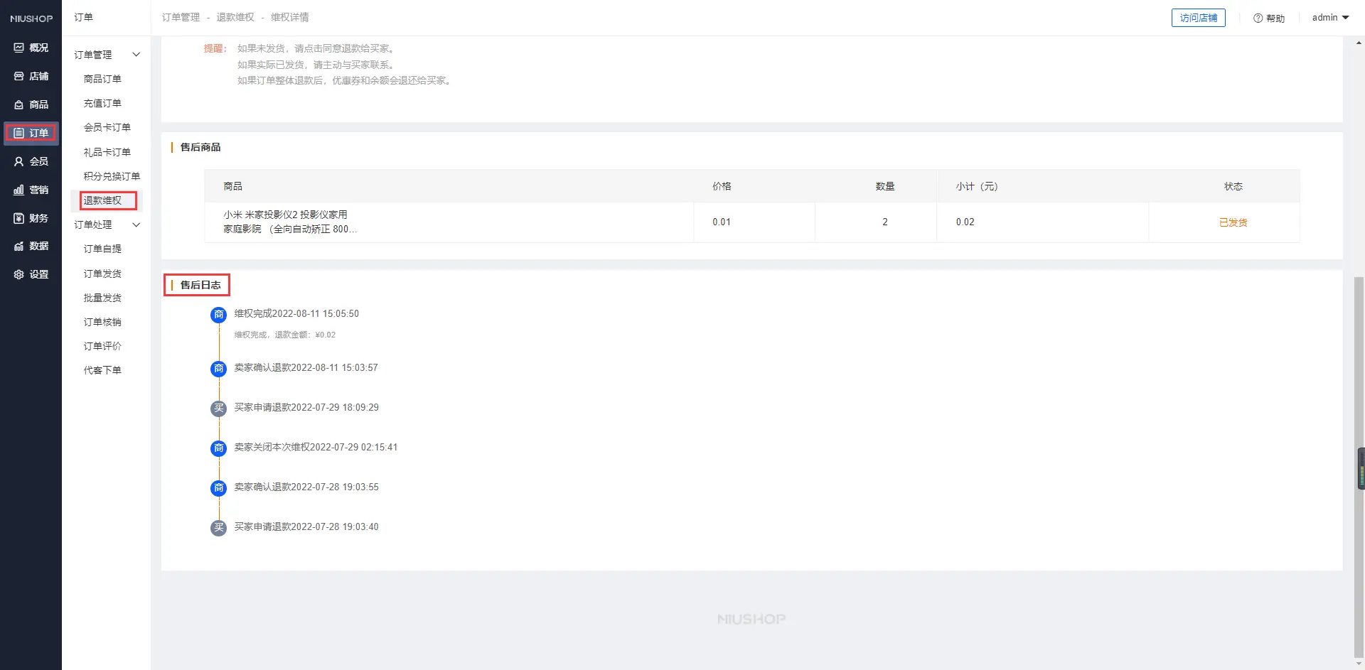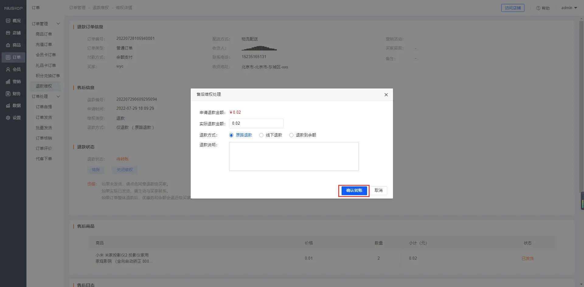 一、功能介绍 单商户系统,退款维权,客户在购买商品后在未完成订单的情况先可以进行退款维权,商家会在1-3个工作日进行退款。 二、操作流程 客户发起退款,客户也可以撤销维权与查看维权详情 在客户发起后,后台会接受到退款信息,点击查看详情可以进行同意或者拒绝操作 在商家拒绝维权操作之后(拒绝必须有拒绝的理由哦) 商家同意之后可以进行转账(转账之后会以支付方式原路返回到客户的账户)