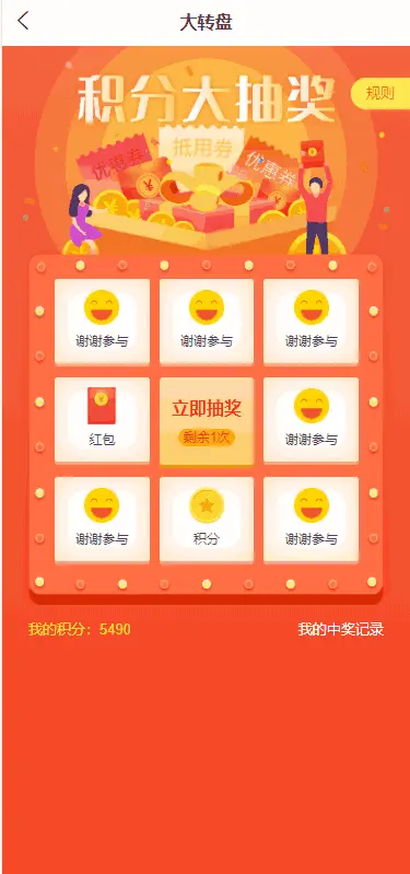 4)活动类型:无限制抽签、积分抽奖(商家可设置每抽一次需要消耗多少积分)