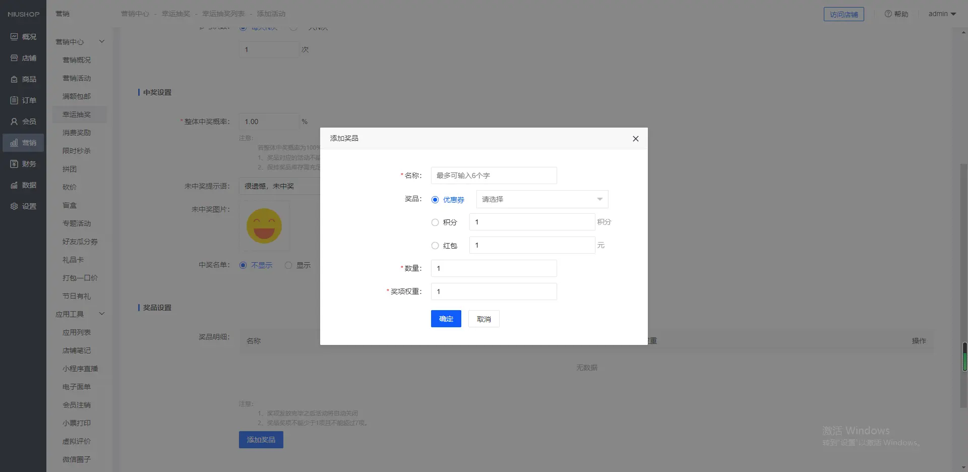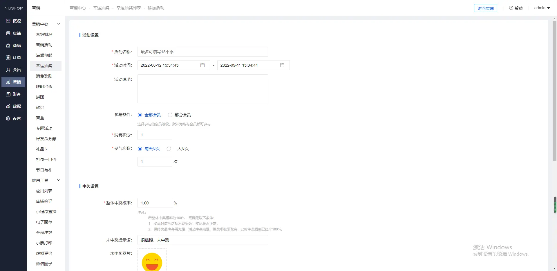 针对活动可以设置活动的抽中概率,抽中的奖励与参与的会员指定还是全部会员