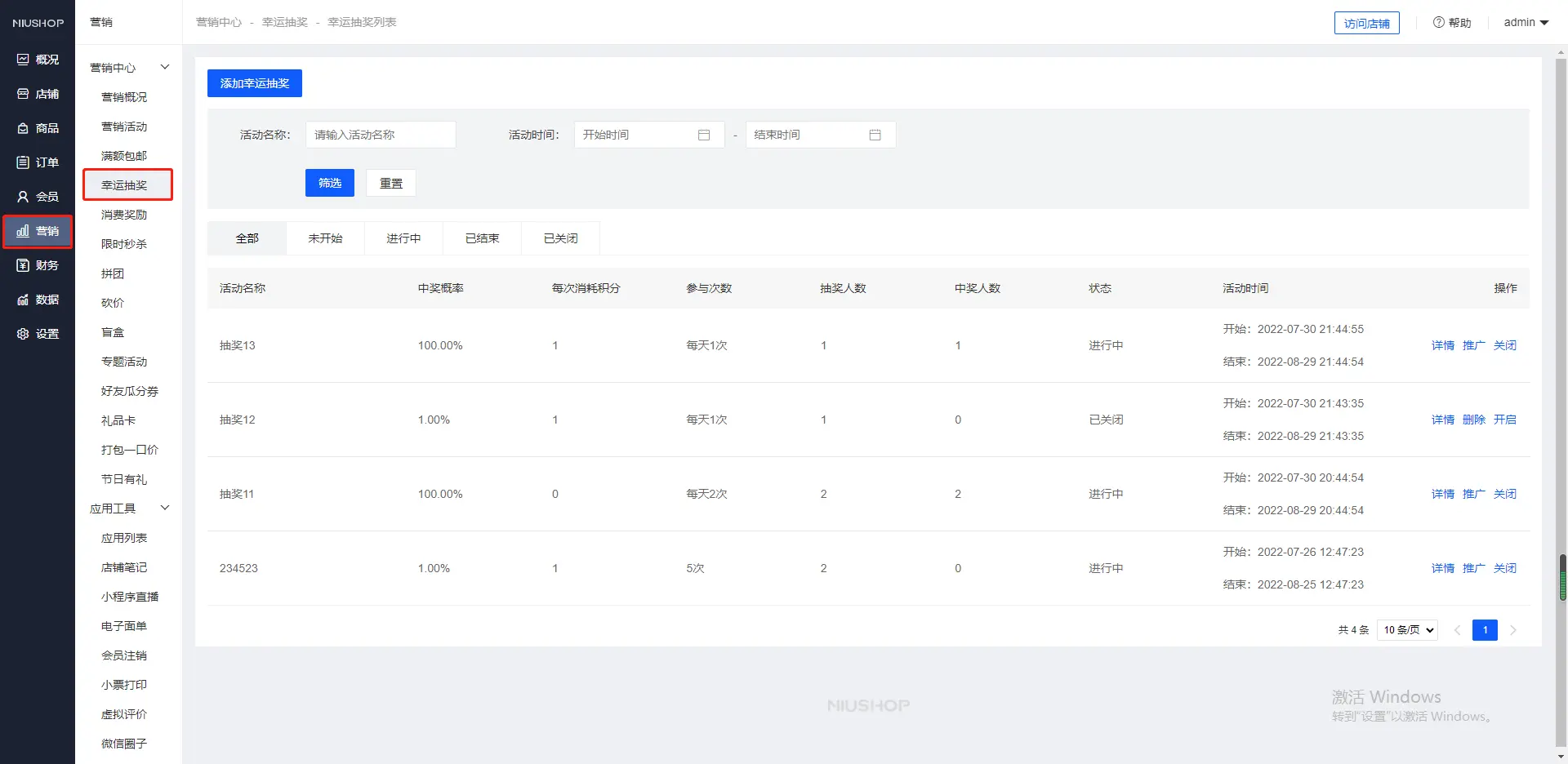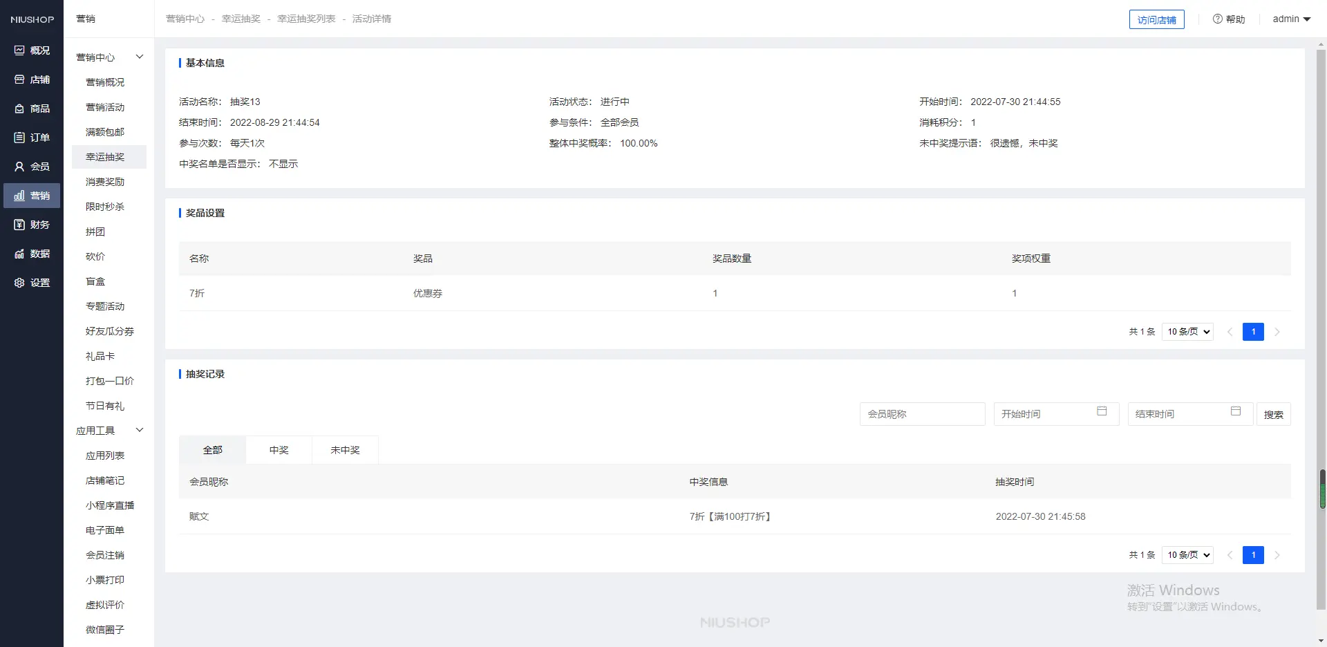 商家可以查看会员抽奖记录,进行活动的推广与新建“幸运抽奖”