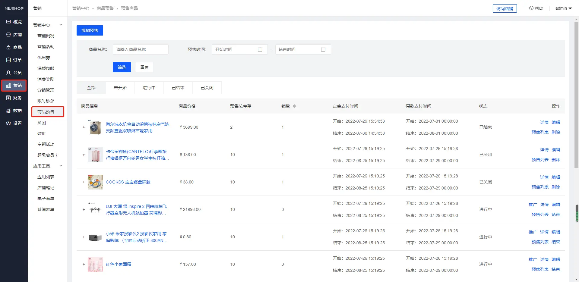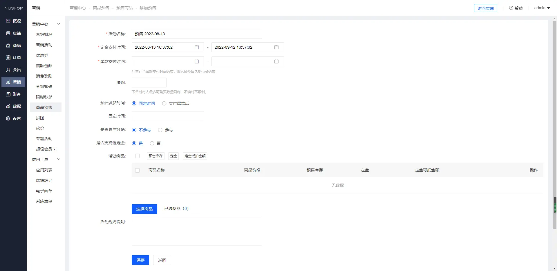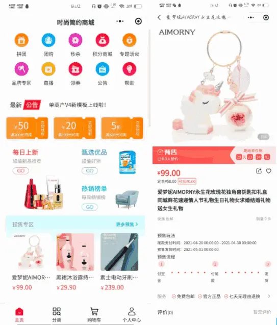 【预售】一般,预售是指消费者先交付定金(也称预付款),在未来一段时间内支付尾款后,商家按照实现约定将商品或服务提供给消费者的一种模式。 单商户系统商城 V4 预售功能则在基础的预售模式中,增加了定金膨胀的功能,并结合优惠券等营销功能,大大提高活动转化率! 付定金——>付尾款——>发货 添加预售活动尾款支付时间 注意:当尾款支付时间结束,那么该预售活动也就结束限购 下单时每人最多可购买数量限制,不填时不限制。 在小程序首页展示