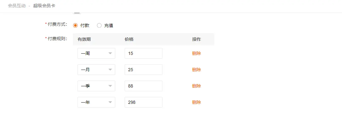 后台可自定义设置超级会员卡付费方式及有效周期价格