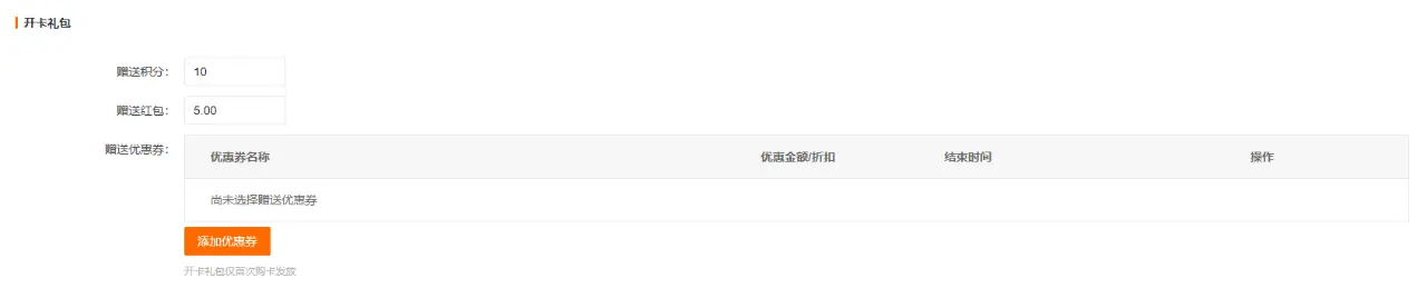 后台可自定义设置开通超级会员卡的开卡礼包:送积分、送红包、送优惠券等
