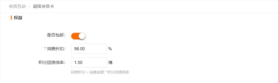 后台可自定义设置超级会员卡权益:是否包邮、折扣价、积分回馈倍率
