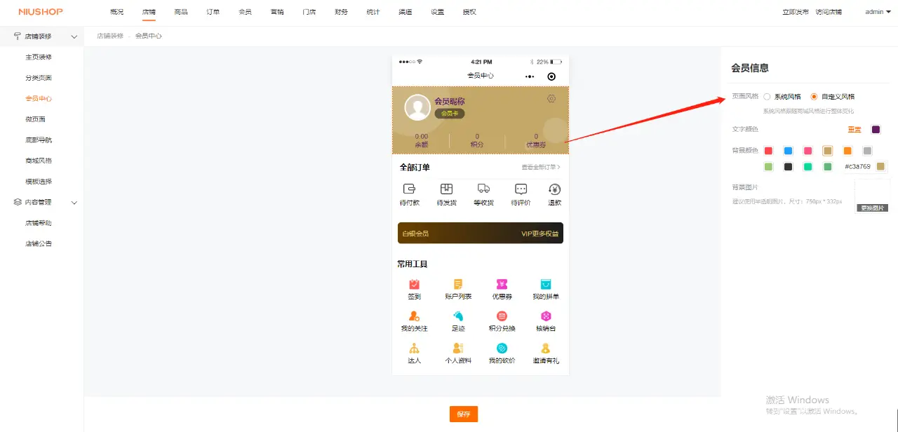 后台可设置会员中心卡面样式、风格