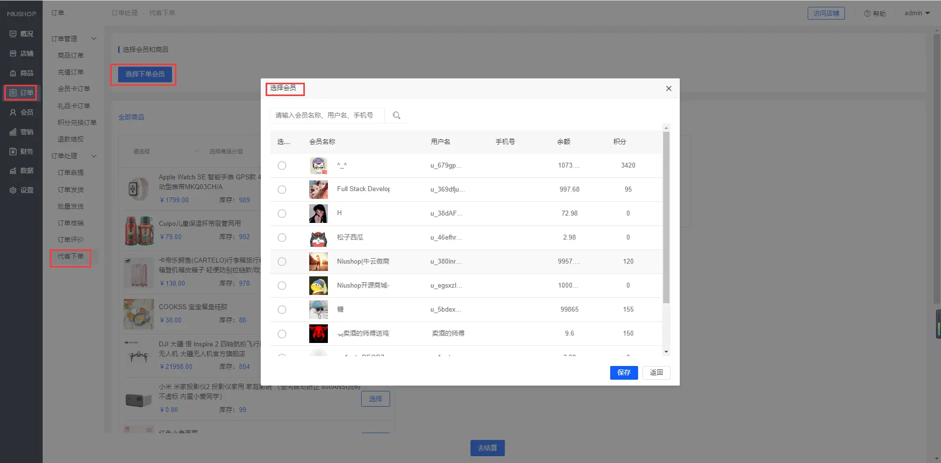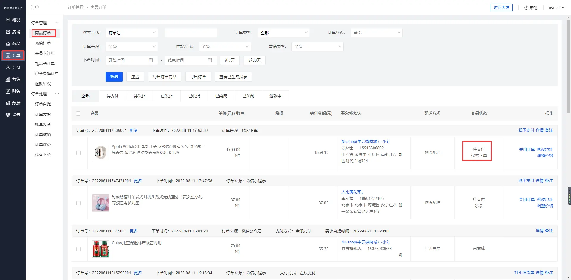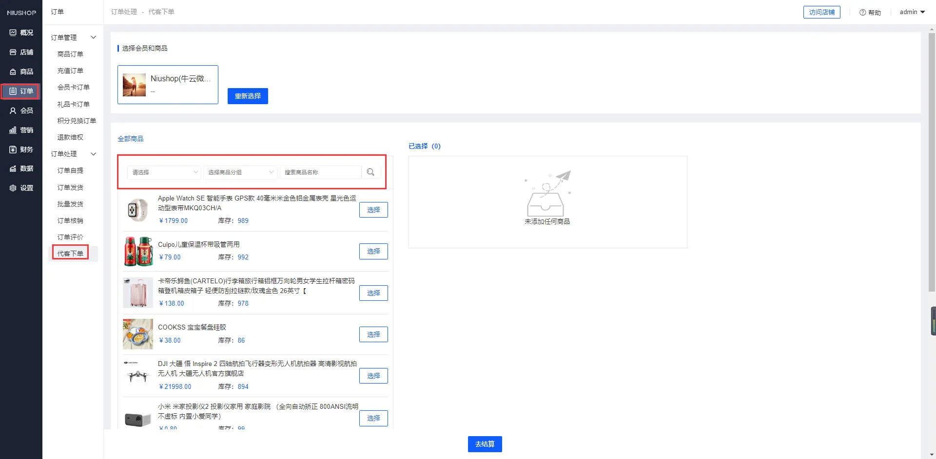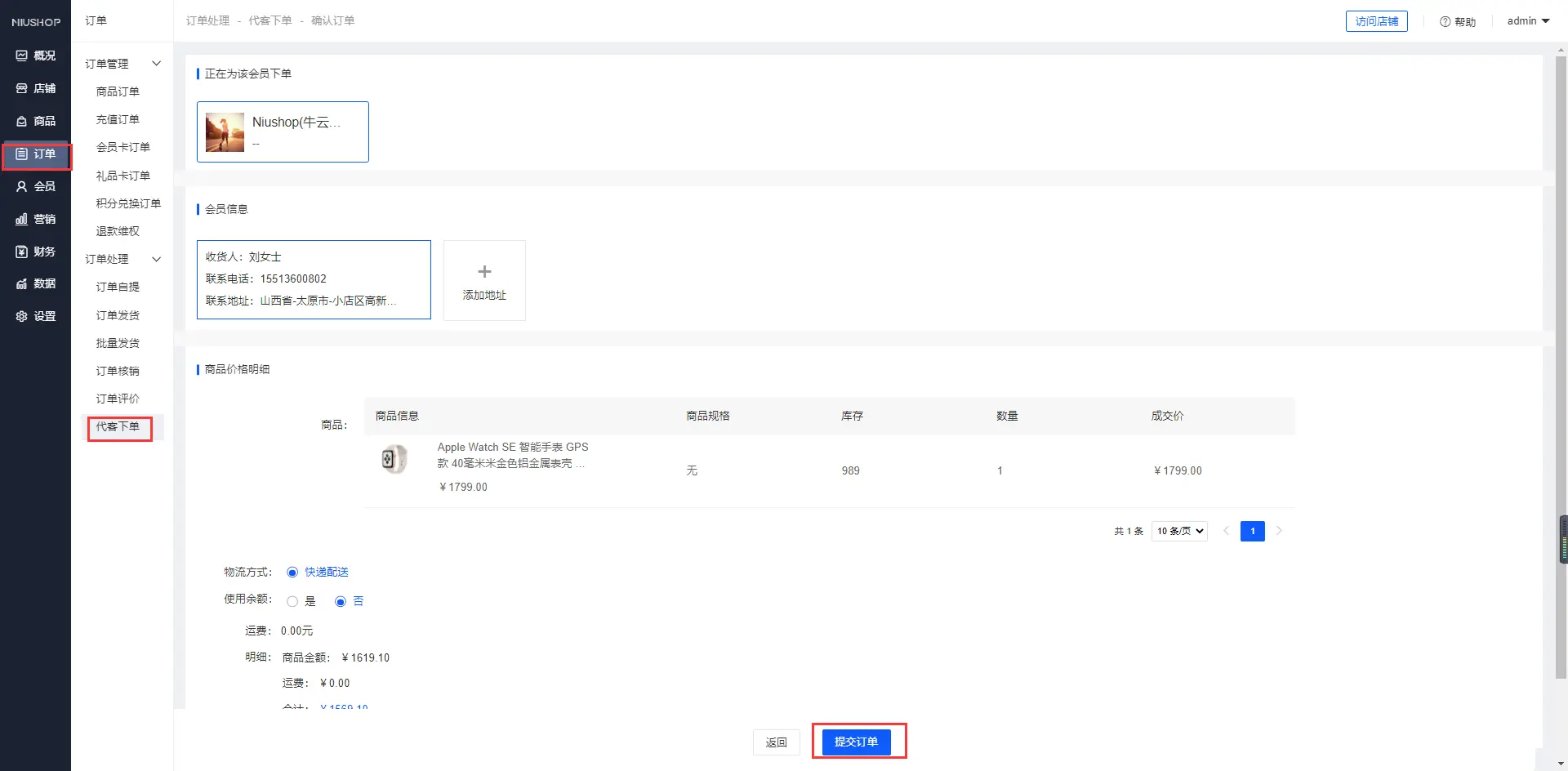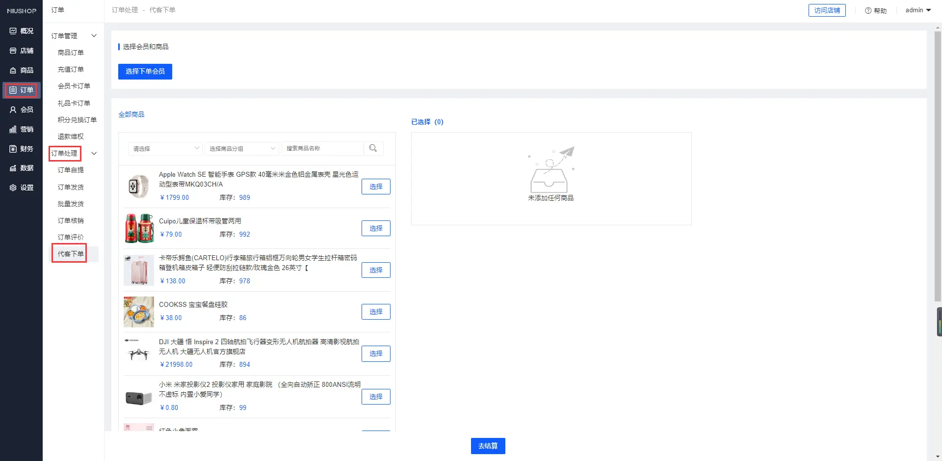 代客下单:管理端代客下单功能可以让管理员直接代替客户进行下单,客户不用自己下单,比较方便。