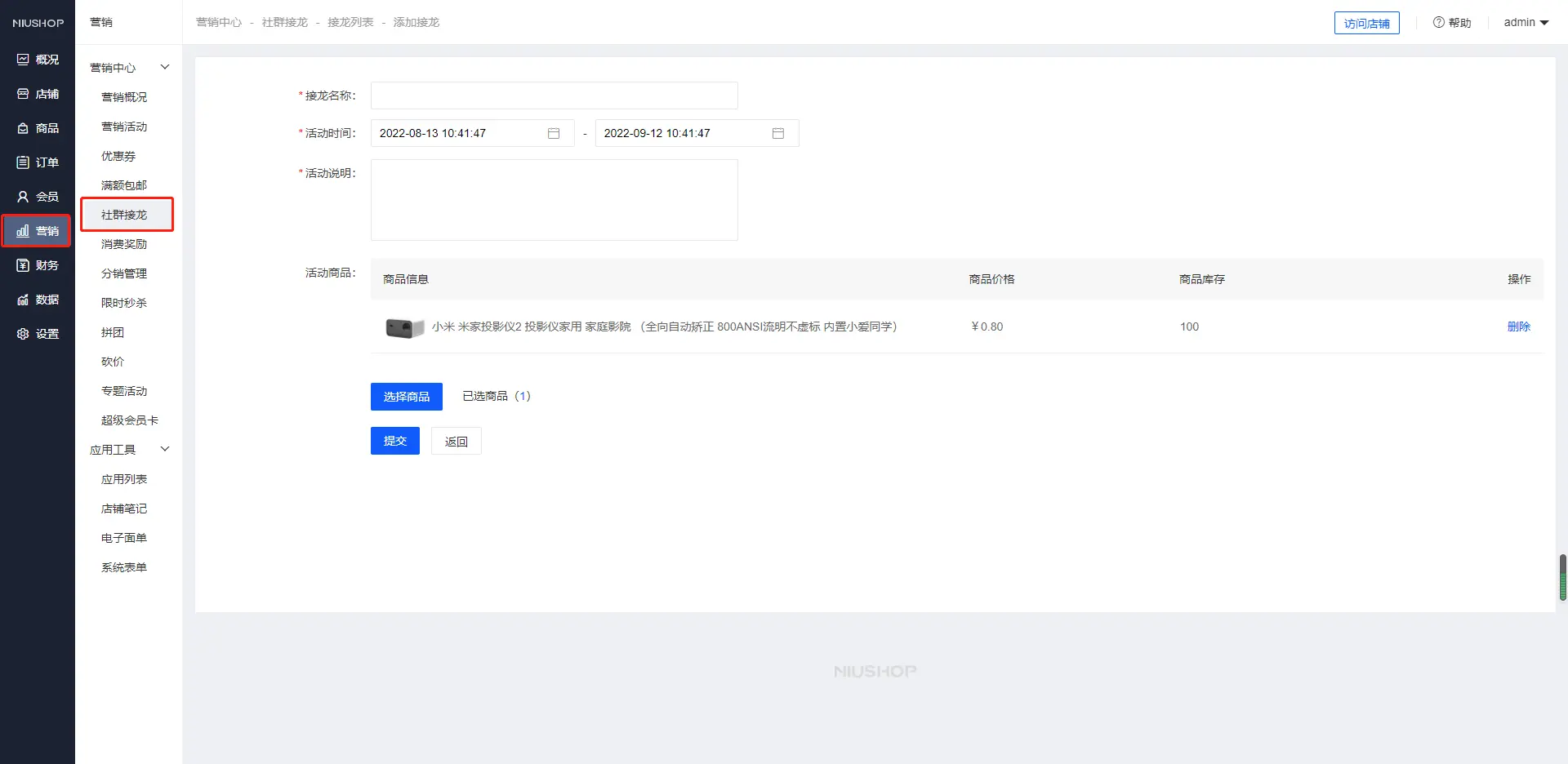 社群接龙操作路径:【营销】→【社群接龙】,自定义活动名称和活动时间,选择参与活动的商品