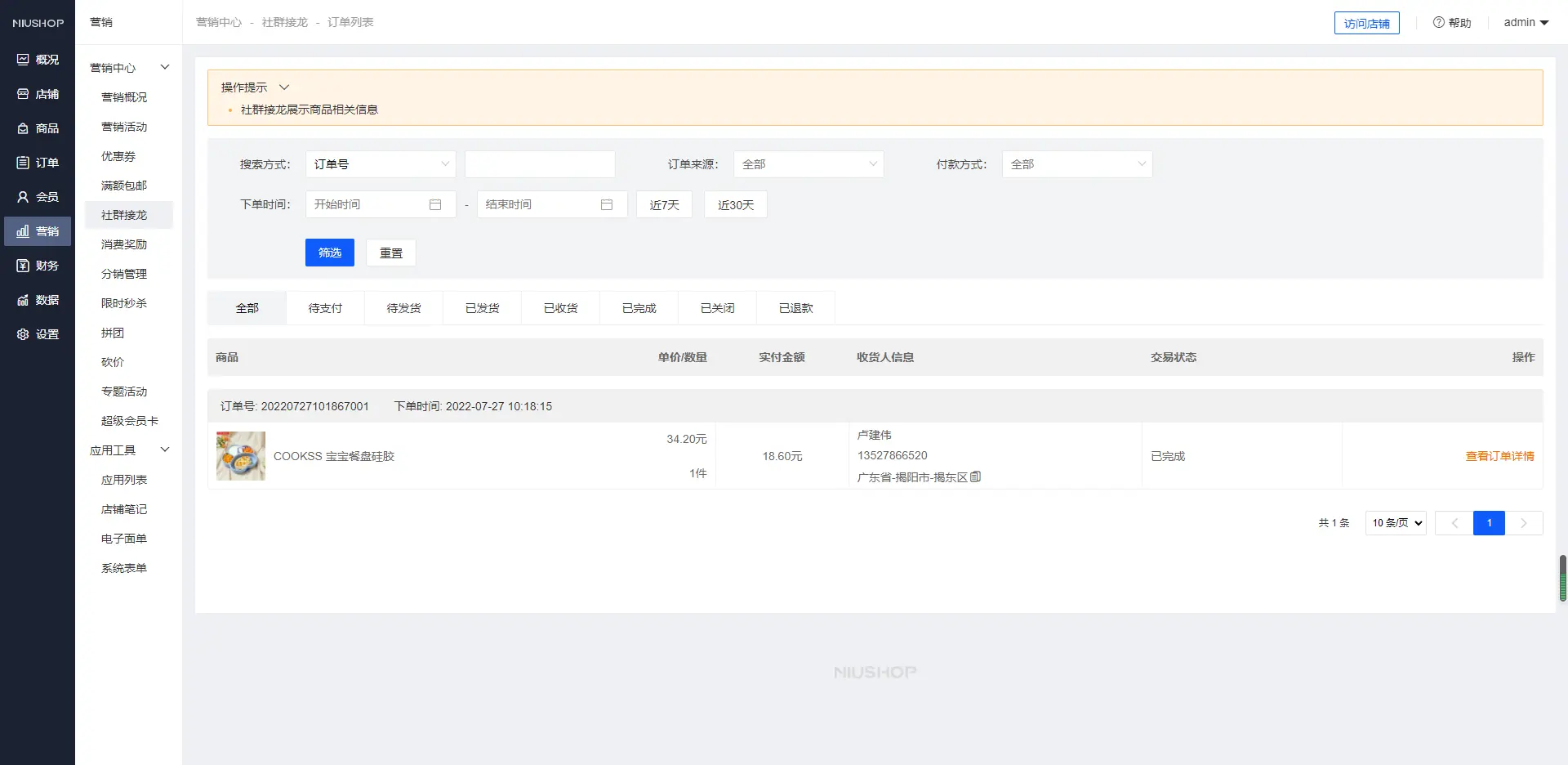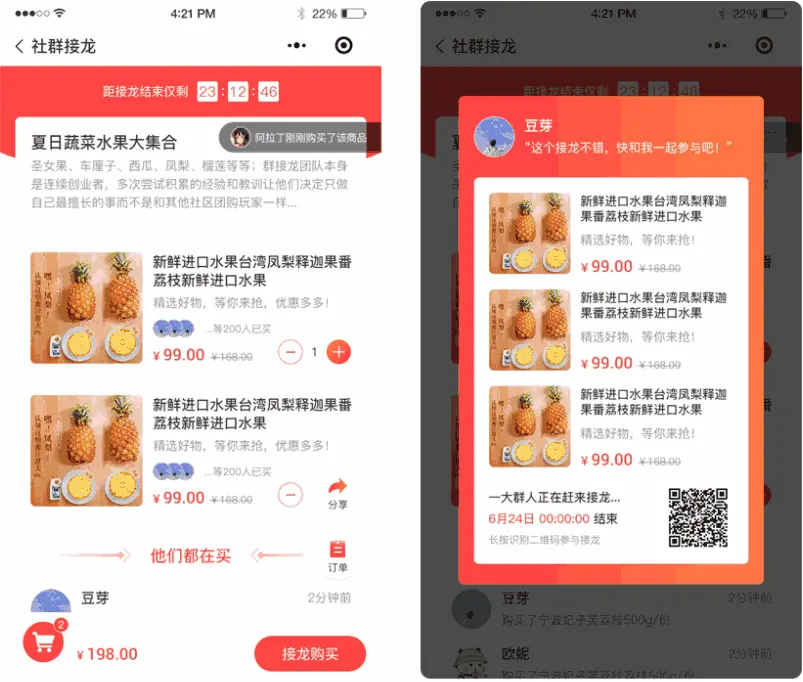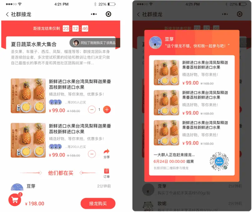 社群接龙:用户可以通过分享推广链接或者推广二维码,小程序二维码和商品海报来接龙购买,快速成单。
