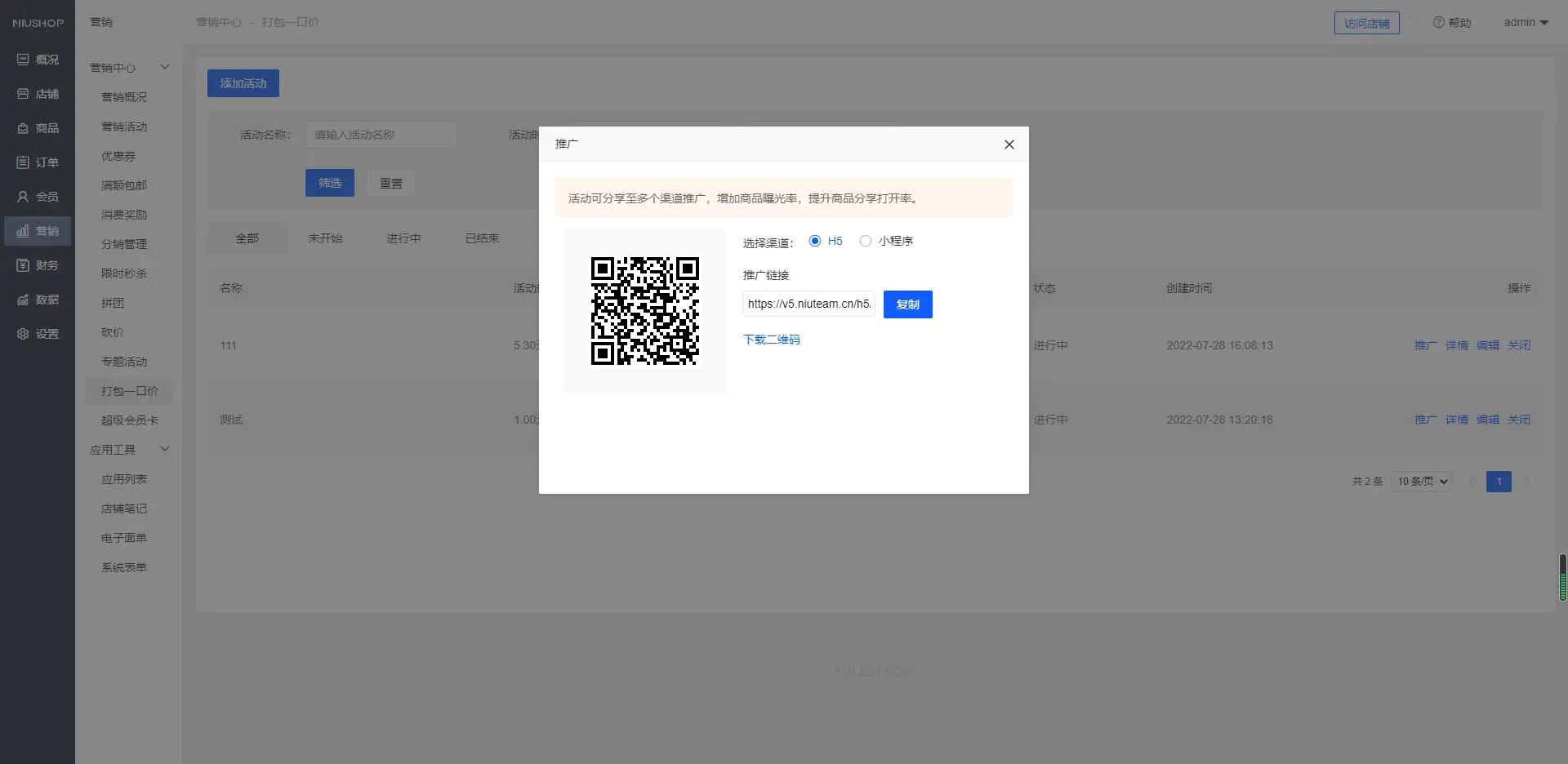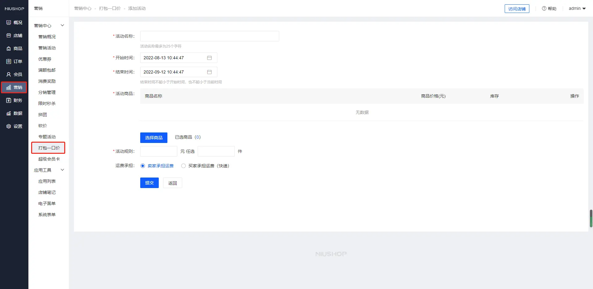 打包一口价操作路径:【营销】→【打包一口价】,自定义活动名称和活动时间,选择参与活动的商品