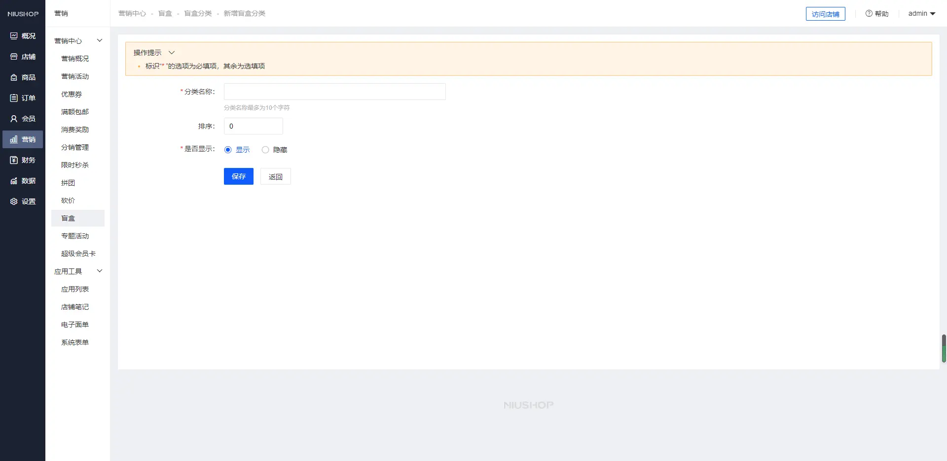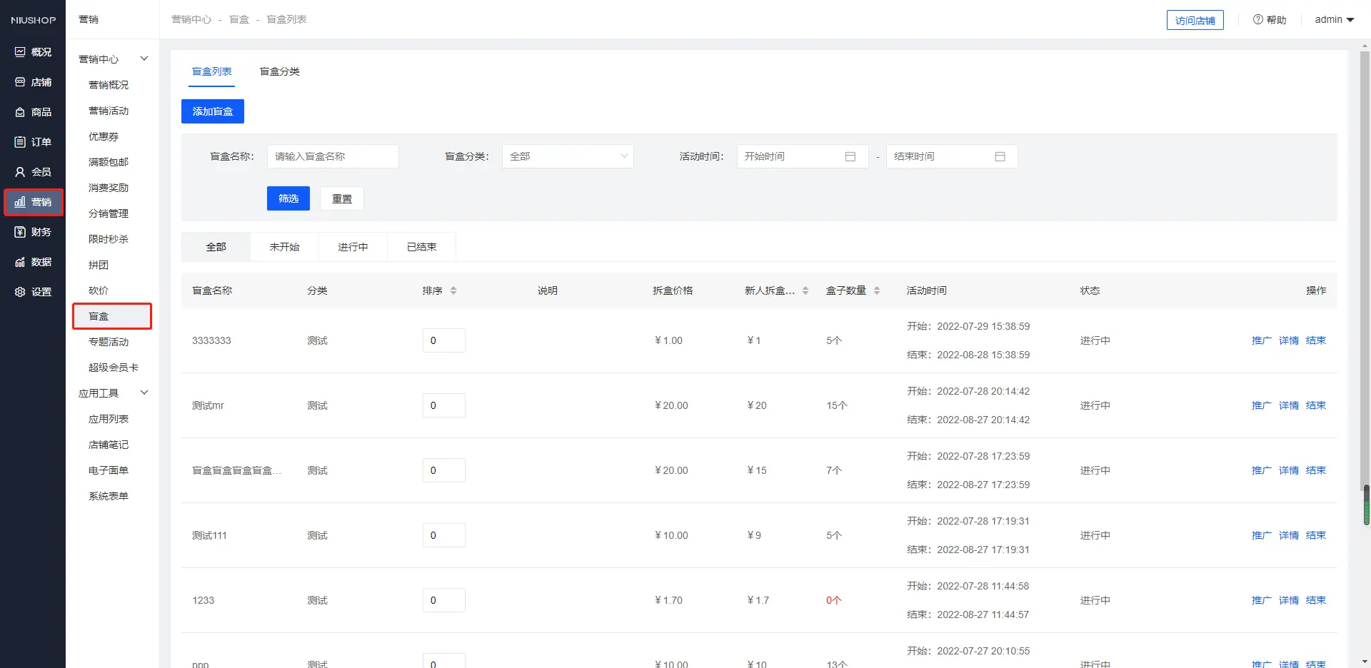增加盲盒操作路径:【营销】→【盲盒】