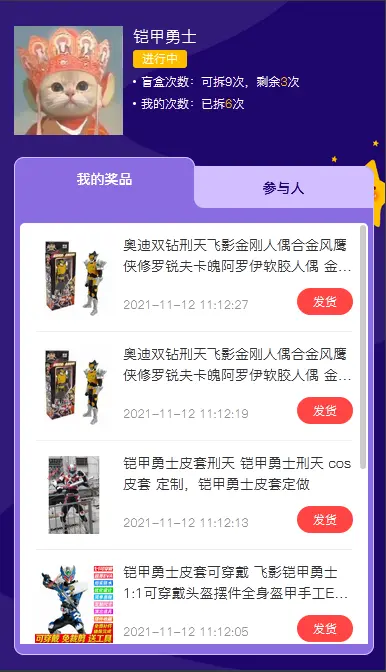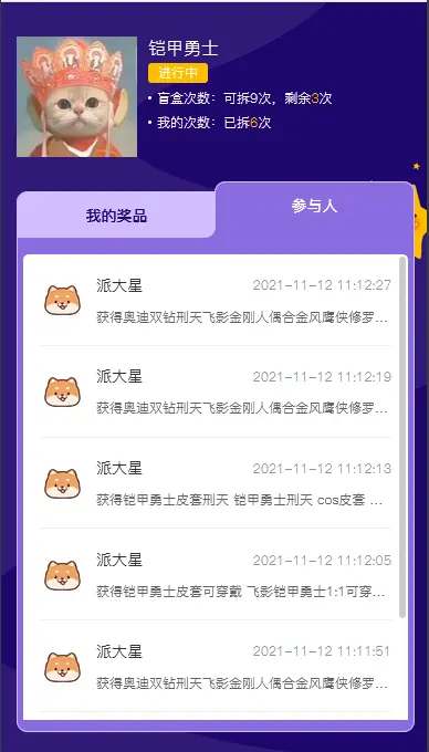 我的奖品页面用户可以查看自己拆到的盲盒商品,以及可以查看参与过此活动(拆过盲盒的)参与人