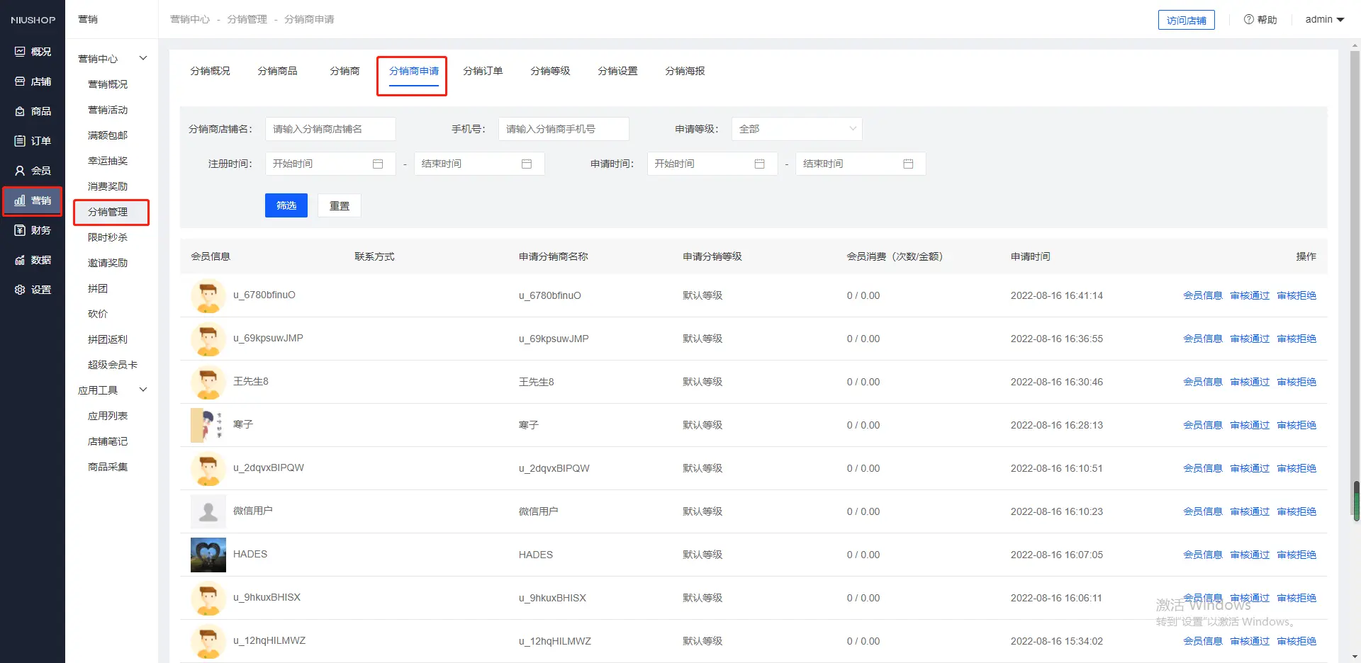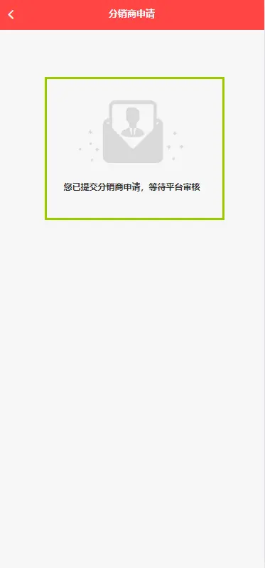 如何成为分销商,分销商的审批 前端申请成为分销商,如下图: 提交了申请之后,等待审核 店铺端进行审核 成功通过审核之后进入分销中心,通过的分销商会在“分销商”列表展示提示 当发现该分销商有问题的话,可以进行冻结,冻结的分销商下级产生的分销佣金也会进入账户,但是该用户不能进行操作(不可以提现)