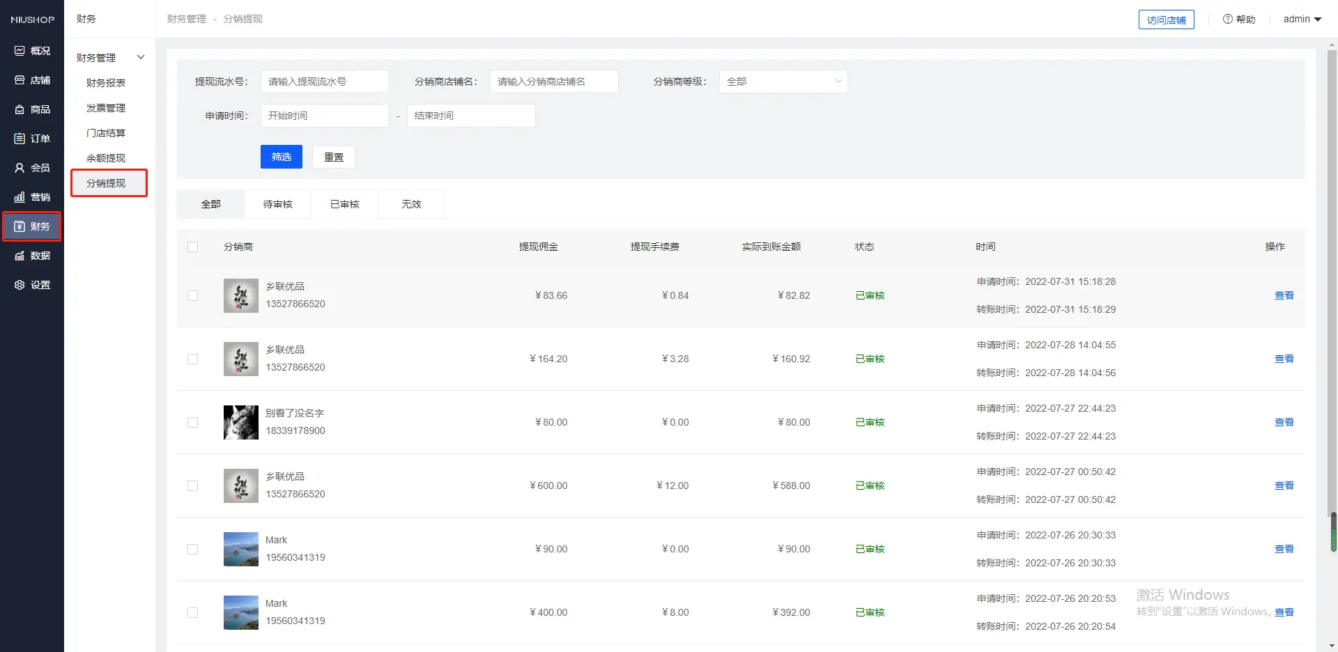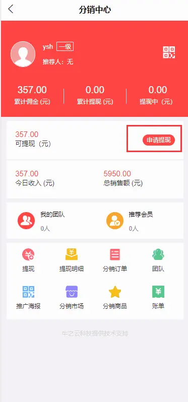 店铺里申请成推广员的分销商所赚取佣金可以提现。 设置最低提现佣金,设置佣金提现手续费百分比,设置免手续费区间(提现也可以设置自动审核) 商城会员在前端申请提现 审核通过之后,提现的佣金会进入到余额