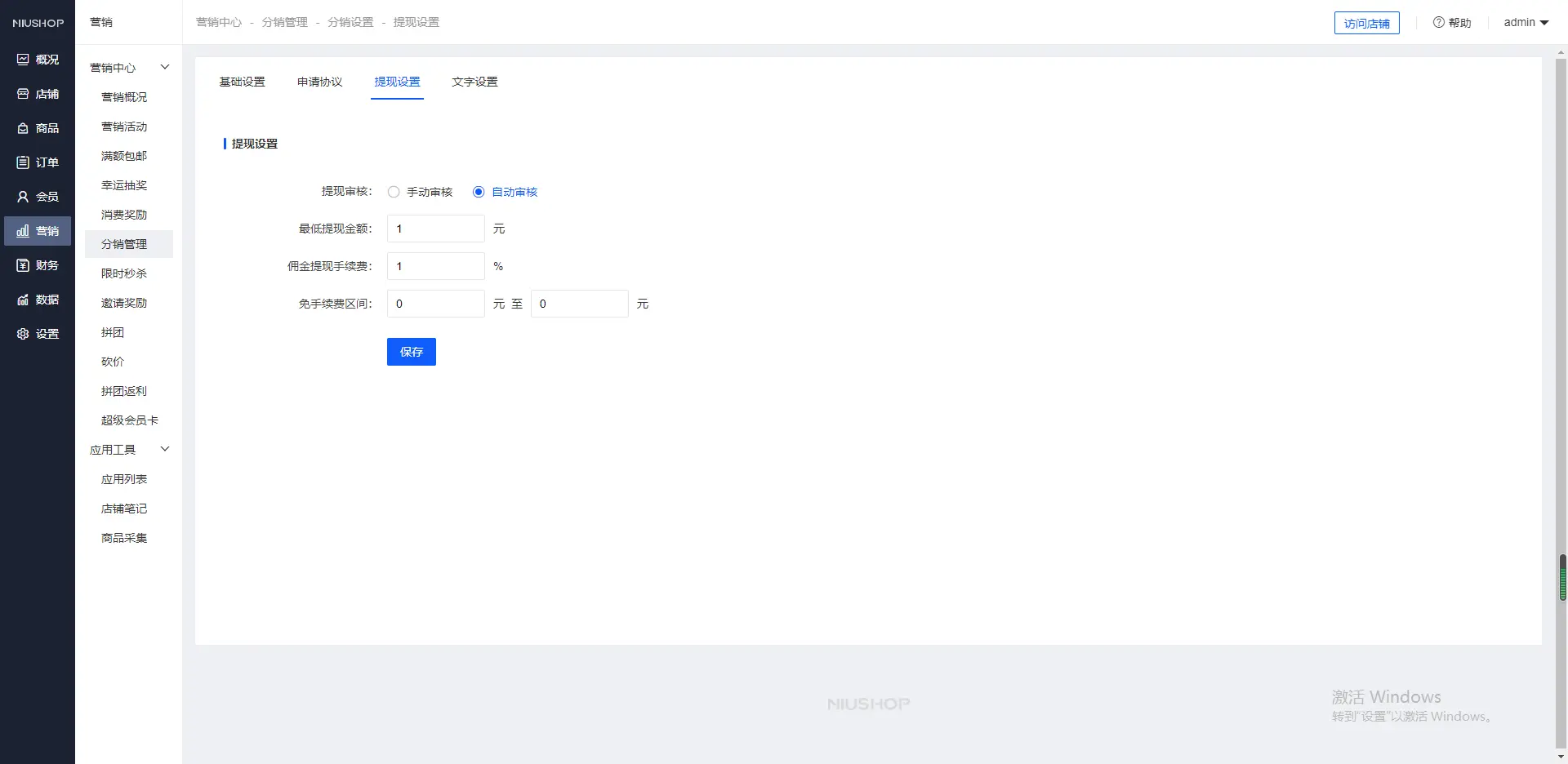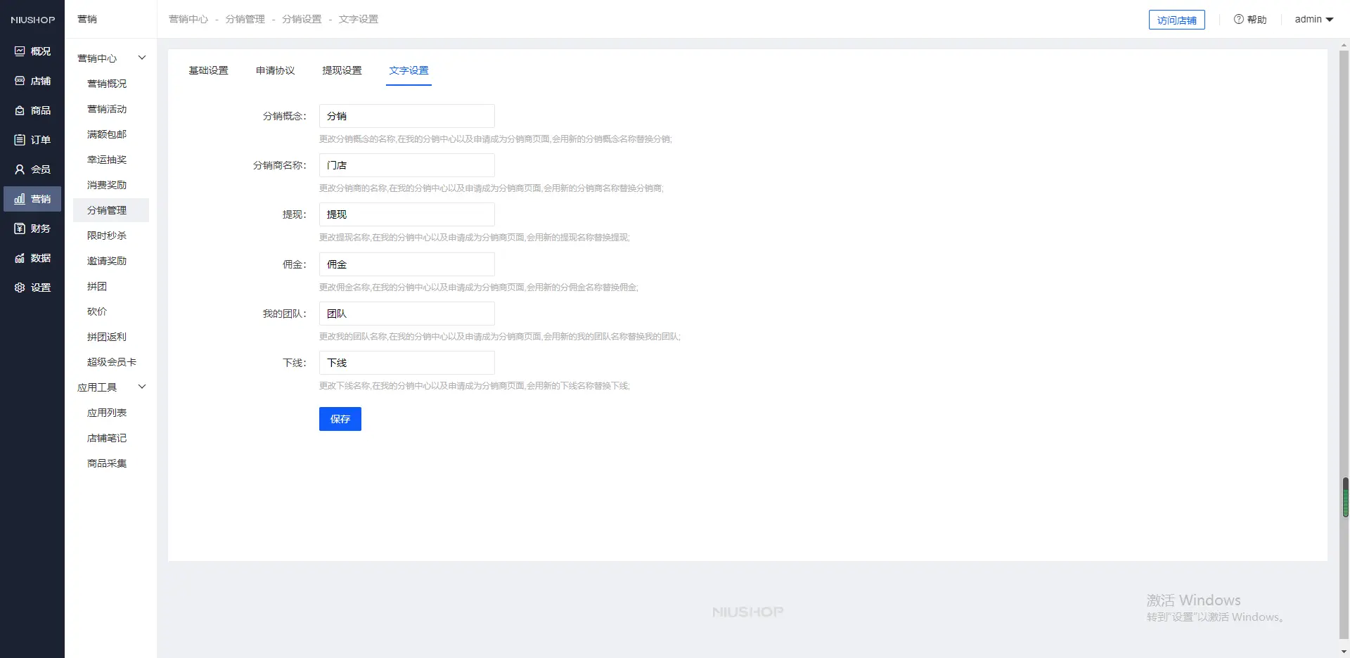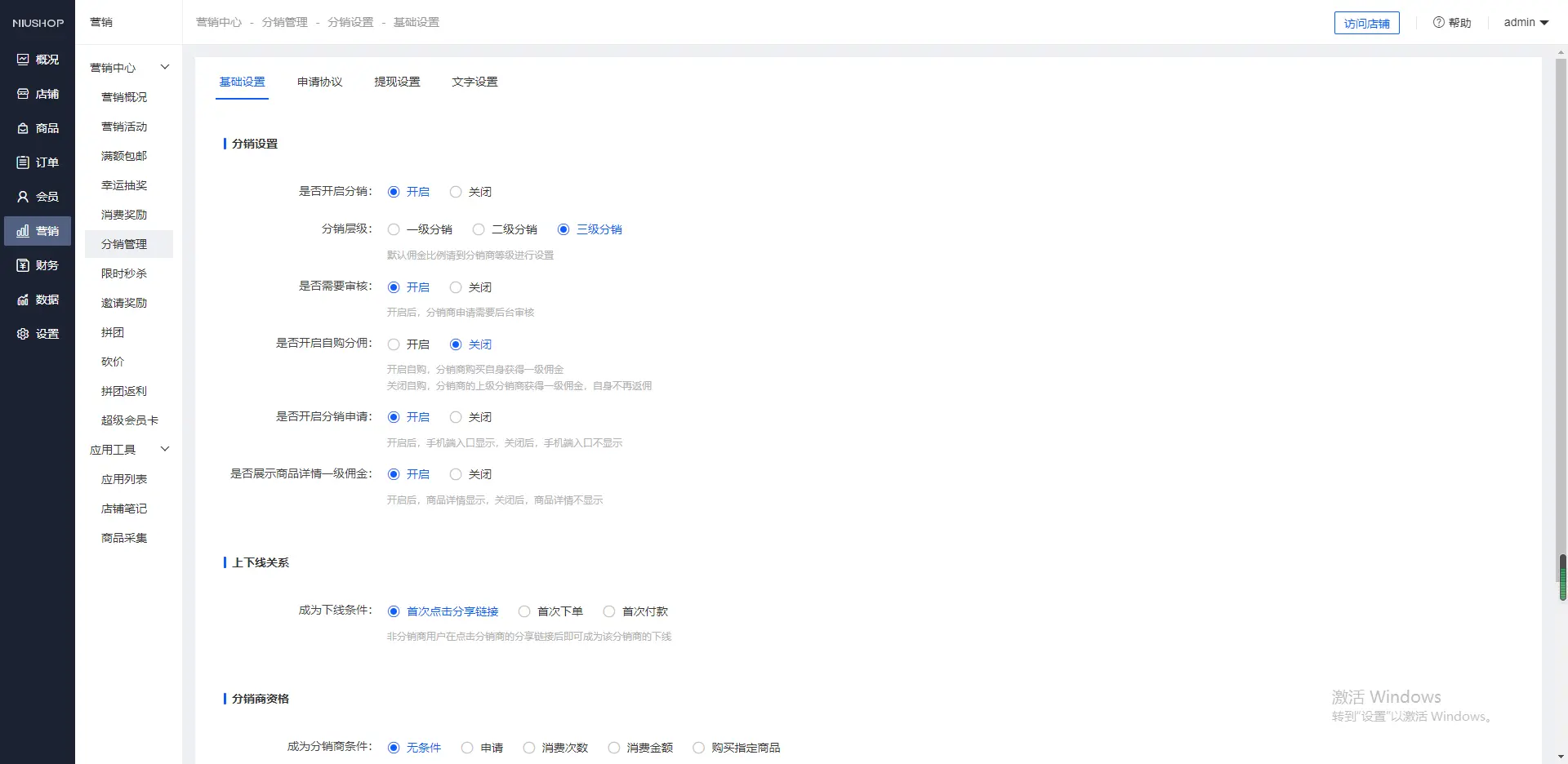 基础设置——是否开启分销,分销的层级(一级,二级,三级),成为分销商是否需要审批,成为分销商的条件(无条件,申请,消费次数达到,消费金额) 申请协议——显示在申请分销商的时候需要勾选的申请协议 结算设置——设置分销佣金提现的限制 文字设置—— 可以设置分销商前端显示的文字描述