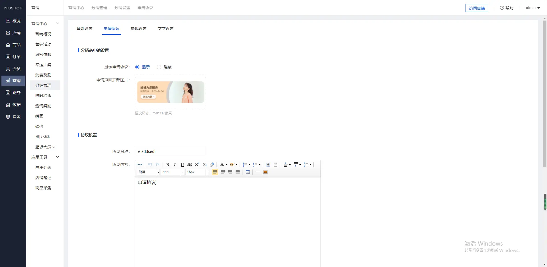基础设置 设置申请协议 分销商佣金结算设置 文字设置