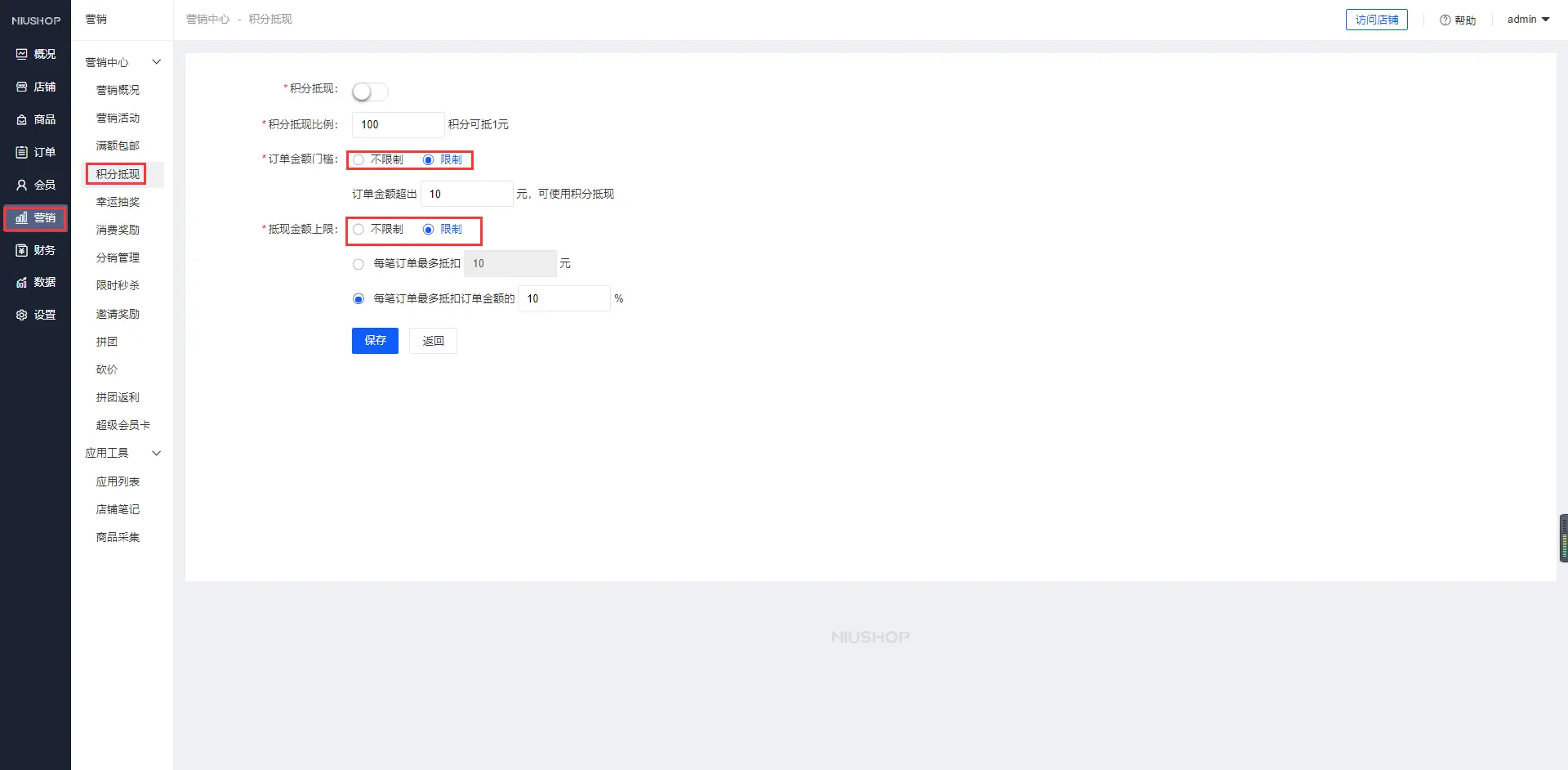 C、抵现金额上限:假设配置抵现金额上限为10元,则无论客户有多少积分,每笔订单最多都只能用积分抵扣掉10元。假设不配置抵现金额上限,则无论订单金额为多少钱,只要客户积分足够,都可以抵扣整单金额(也可以设置抵现上限为订单金额的百分比)