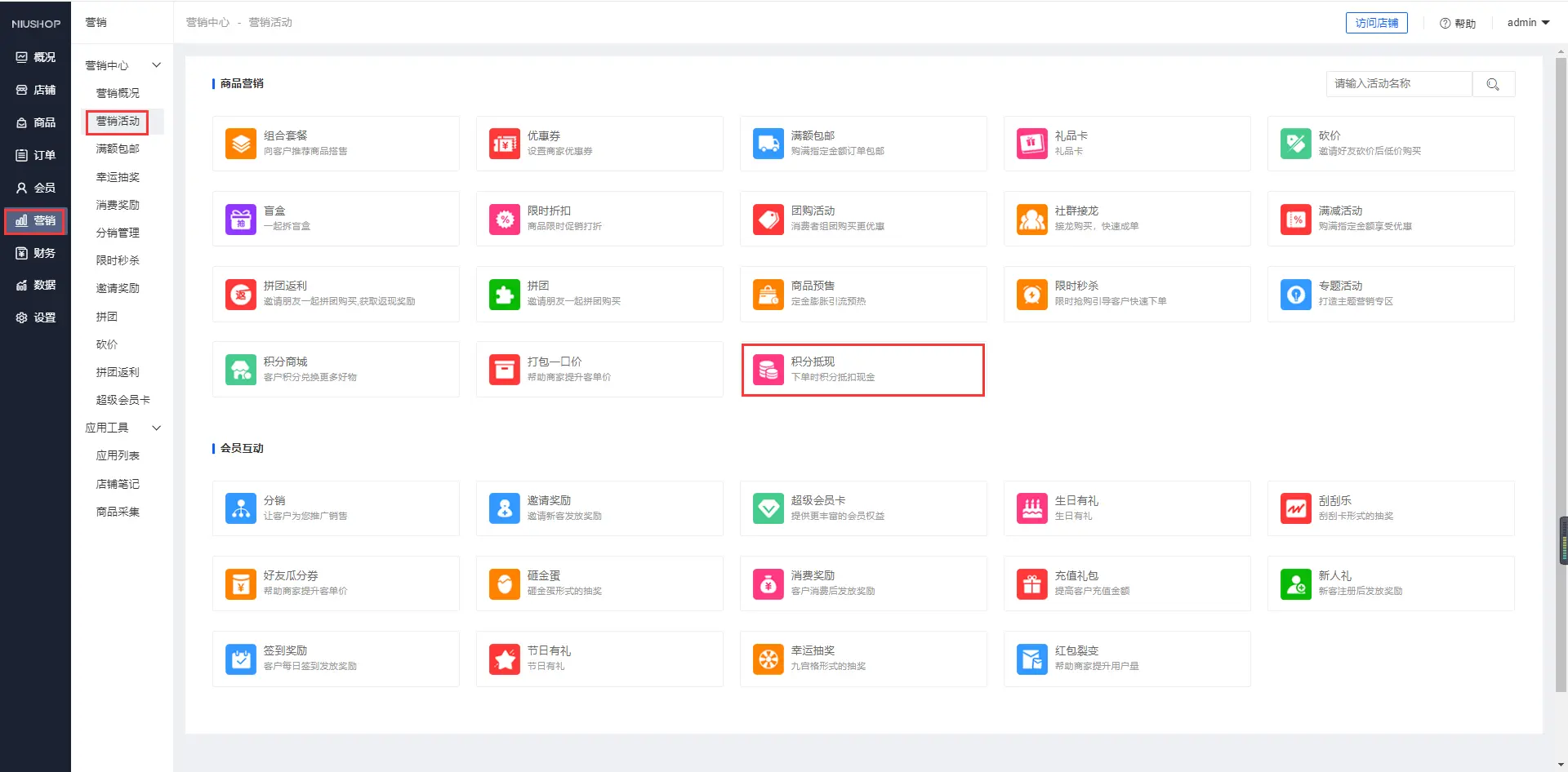 打开单商户V5后台,营销-营销活动-积分抵现,可以设置每笔订单的百分比是最大抵扣金额