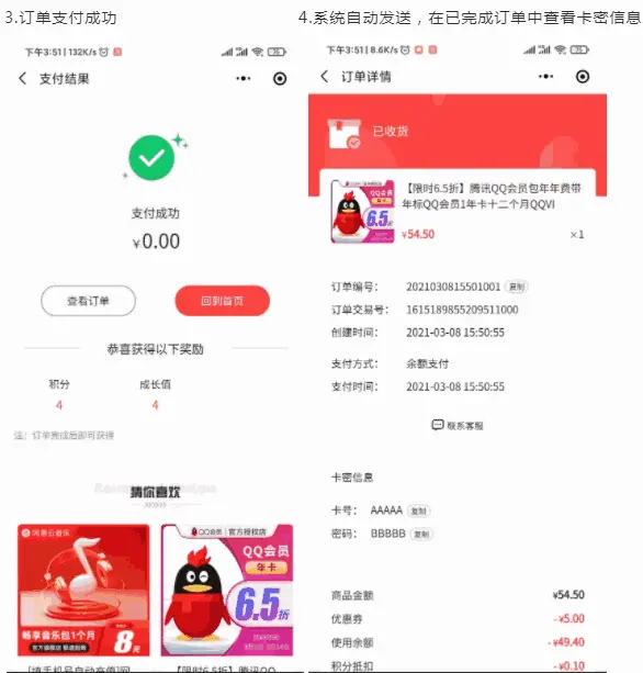 用户在商城下单付款成功之后,系统自动发货,无需物流。用户购买之后可以直接获得卡密。在已完成订单中查看卡密信息。