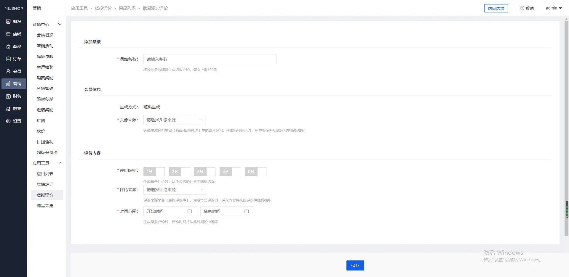 2、支持商品评价随机生成,批量添加时可选择条数,会员头像、评价内容来随机生成