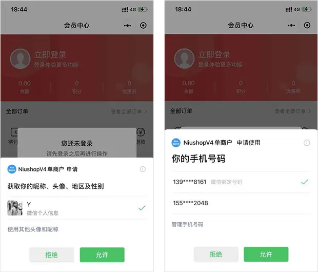 注∶第三方直接注册会员如果不强制绑定手机情况下会导致在不同第三方平台会员无法统一,如果只是在微信环境(微信公众号与微信小程序),可以通过绑定微信开放平台获取unionid实现账户统一。