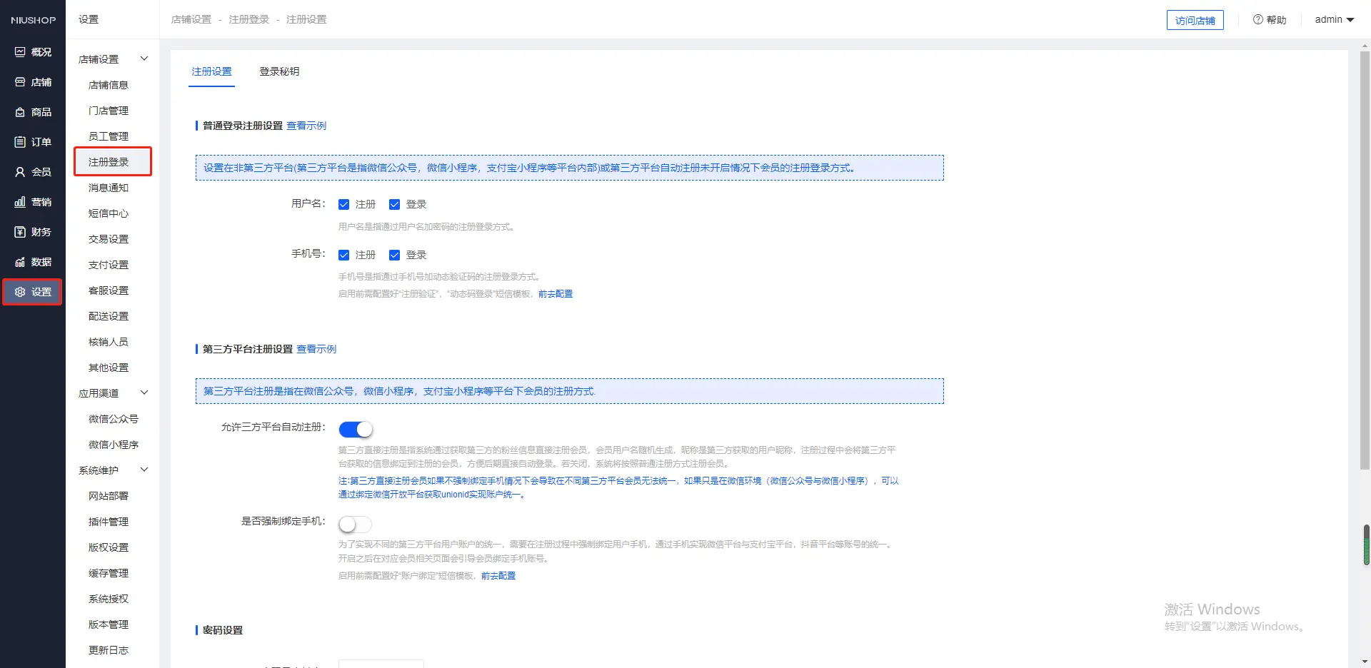 二、第三方平台注册设置(第三方平台注册是指在微信公众号,微信小程序,支付宝小程序等平台下会员的注册方式)
