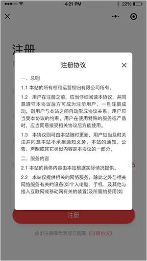 协议内容展示使用该网站的一些相关规定,注册会员时需同意该协议才可继续注册