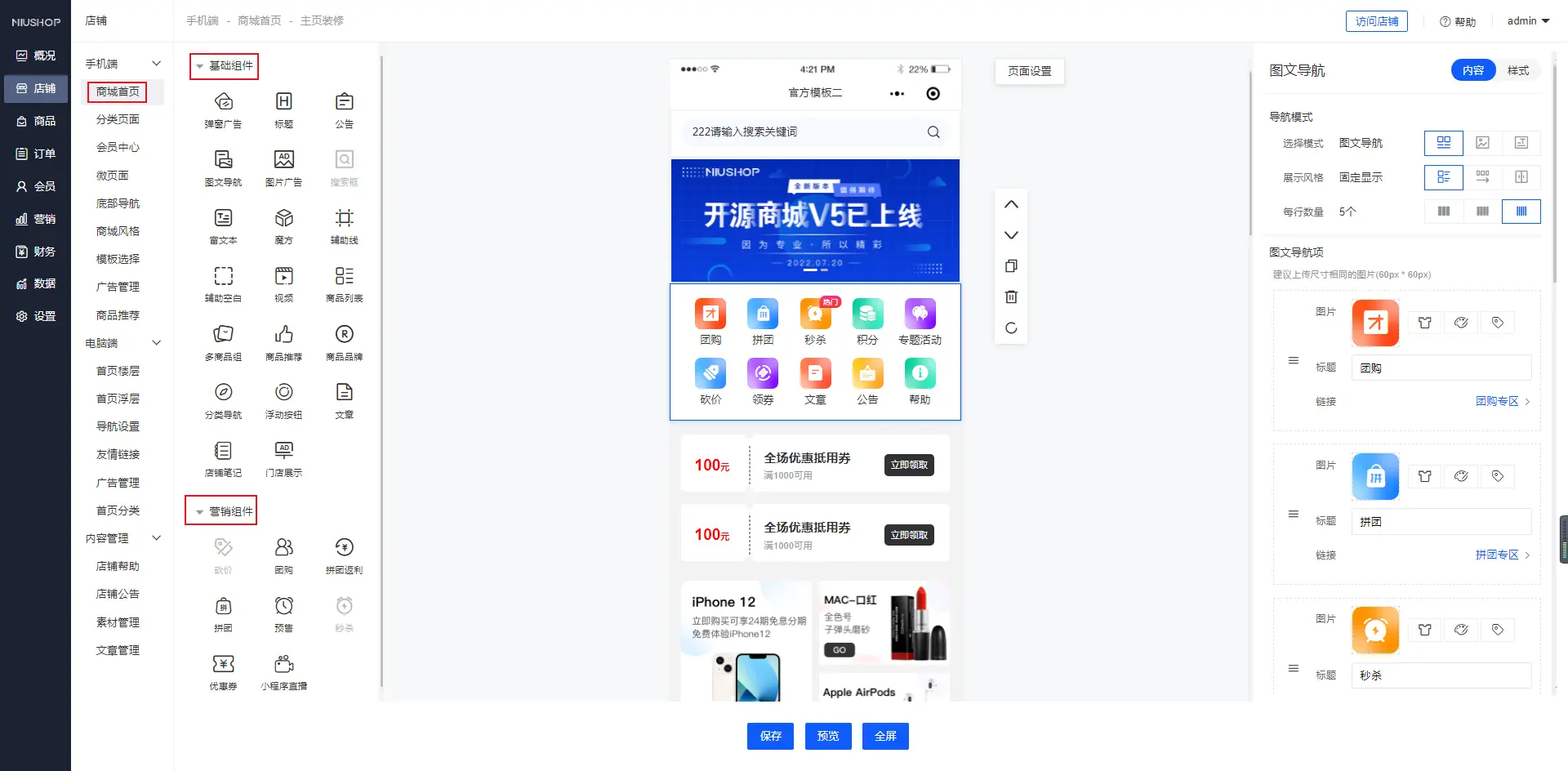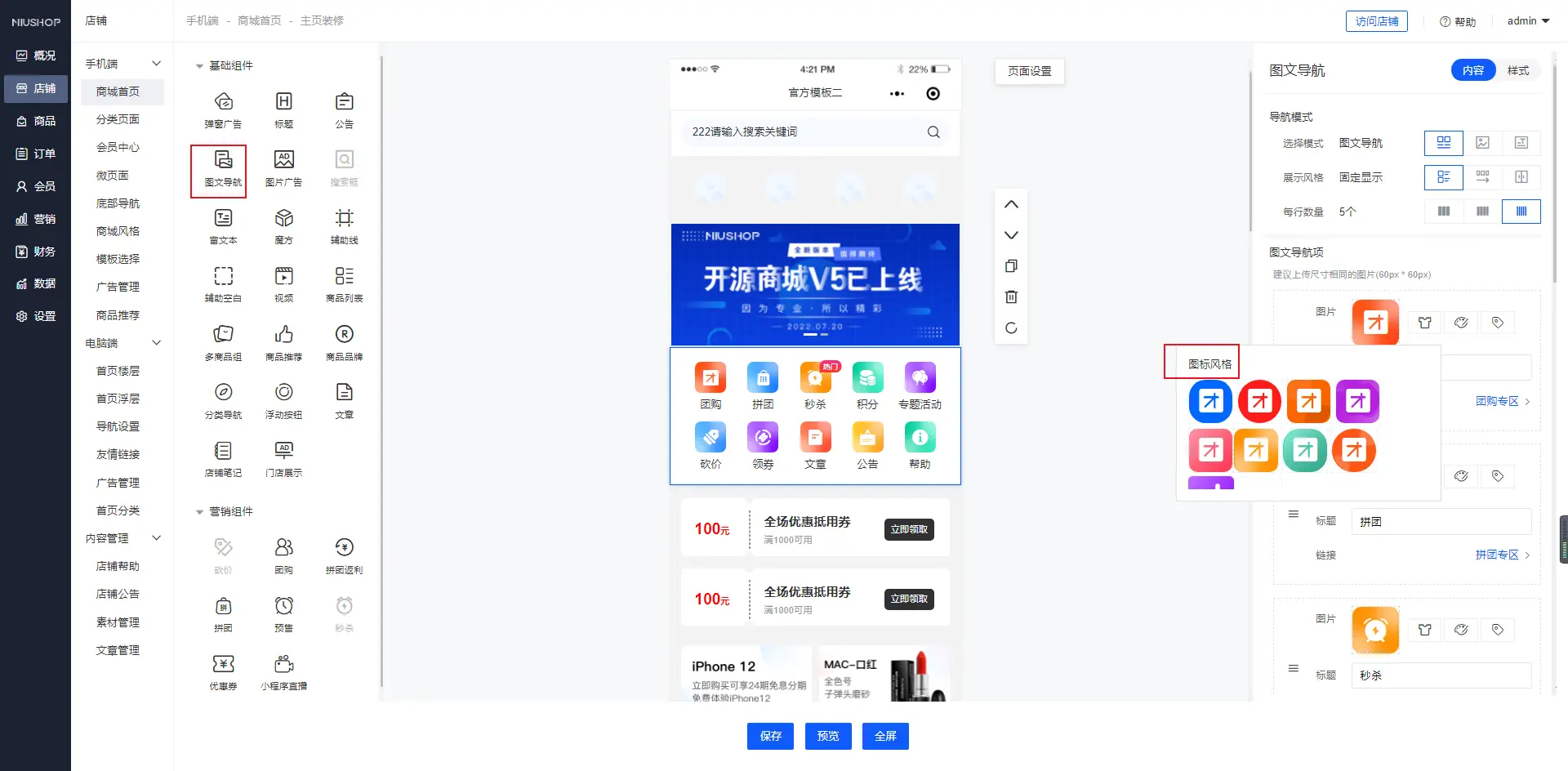 图文导航增加了图标合成功能,多种选择让您不用费心设计,也能做出漂亮的商城