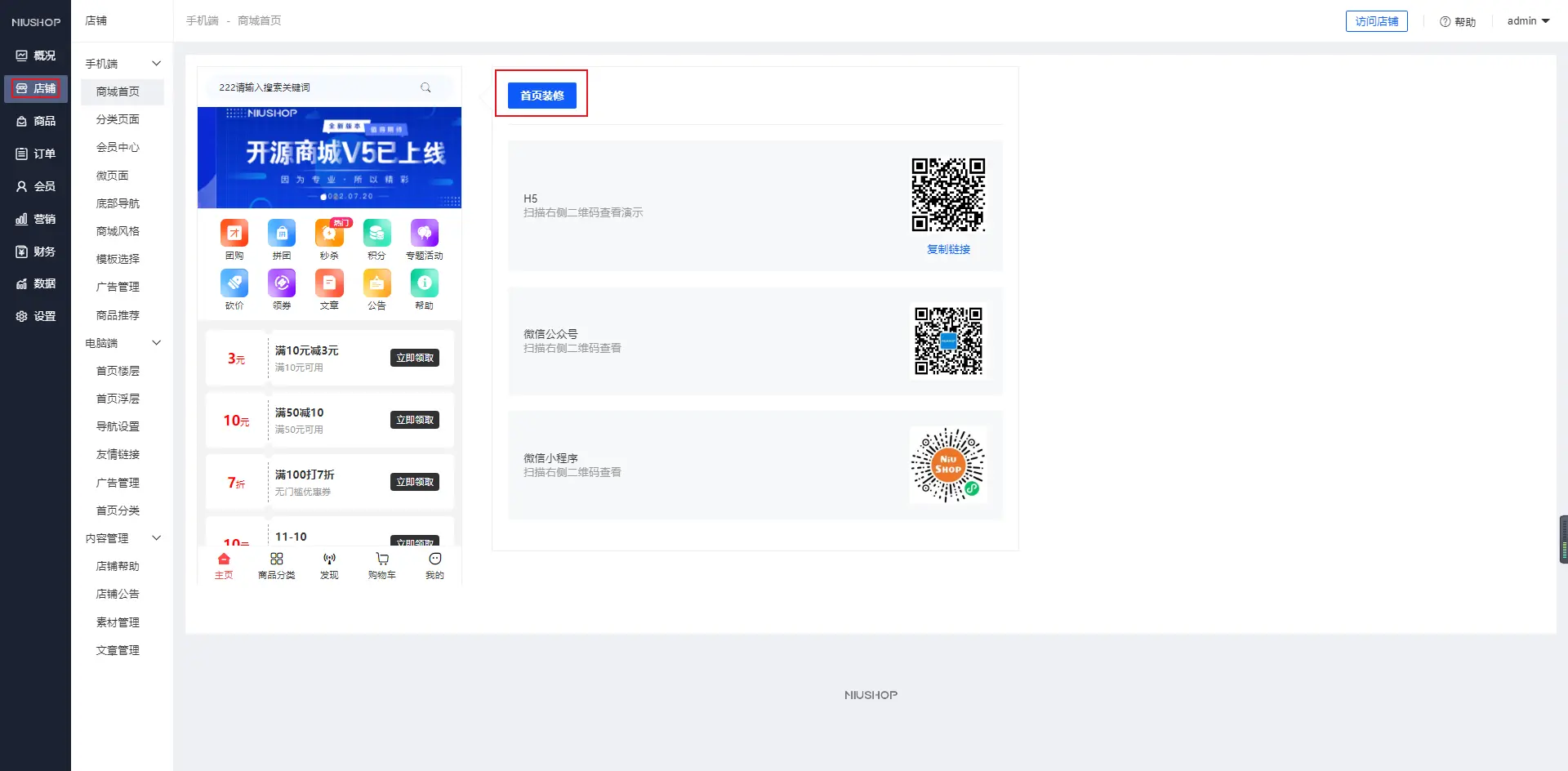 打开首页装修,可以添加基础组建和营销插件自定义首页