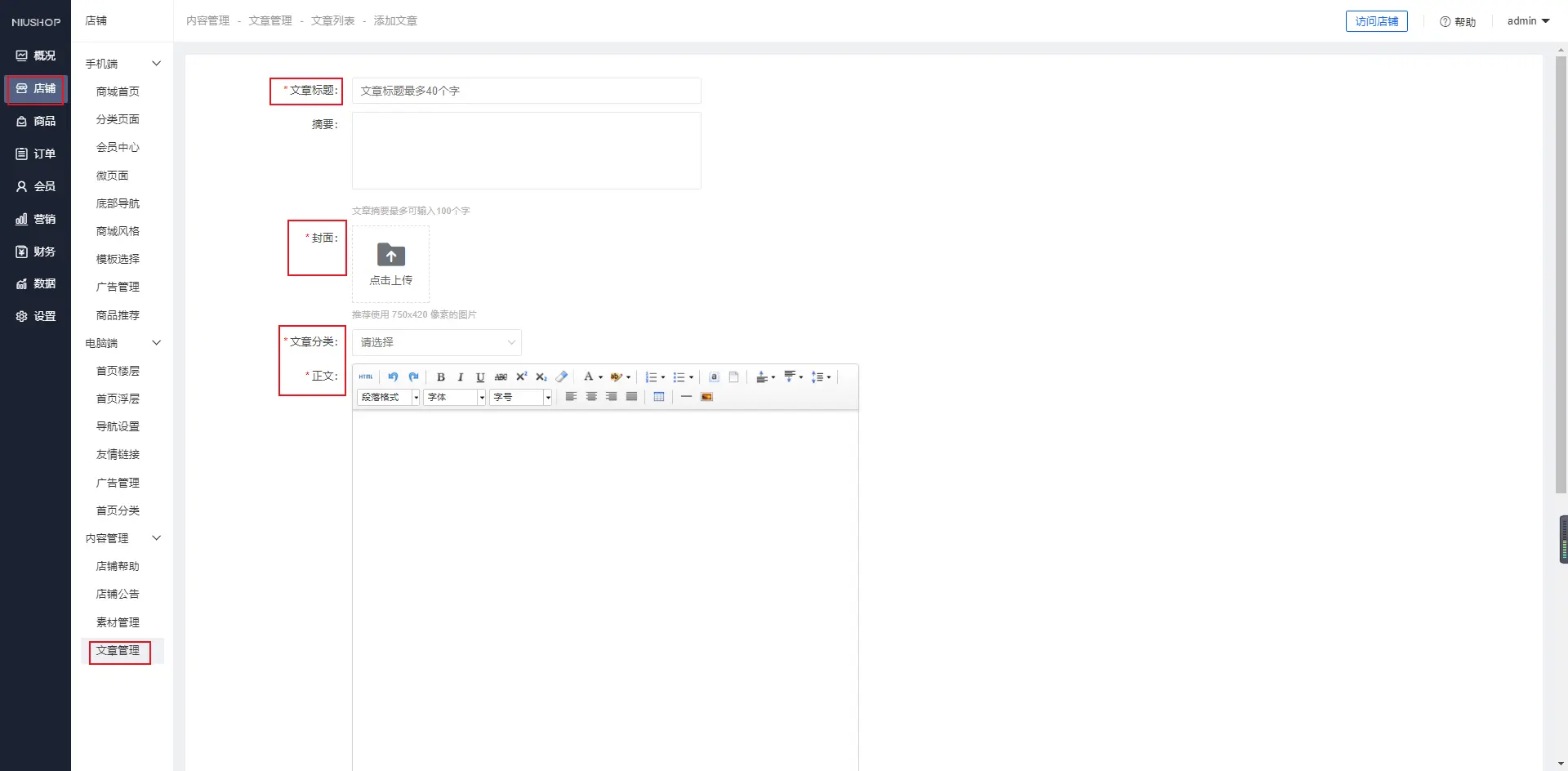 添加文章,用图文的方式介绍商品
