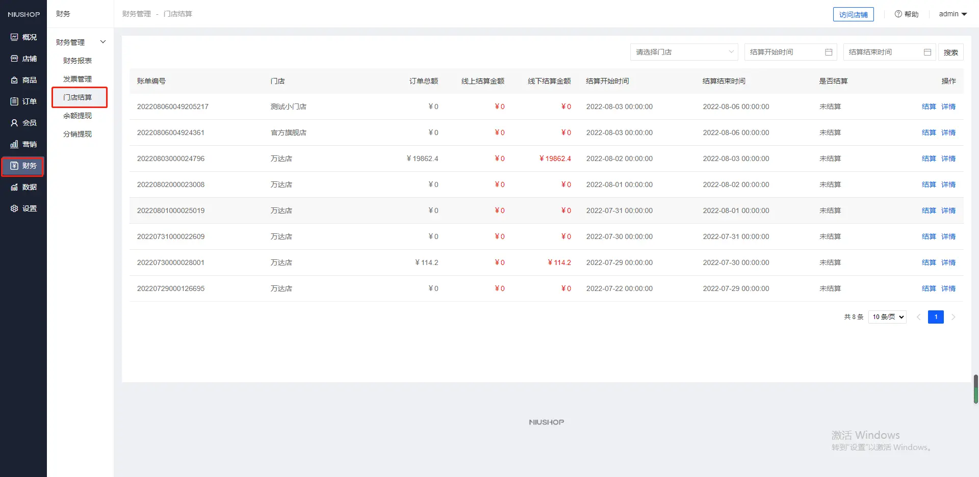 门店结算--店铺下的门店会按照后台设置的周期来结算门店的资金。可快速筛选和查看详情