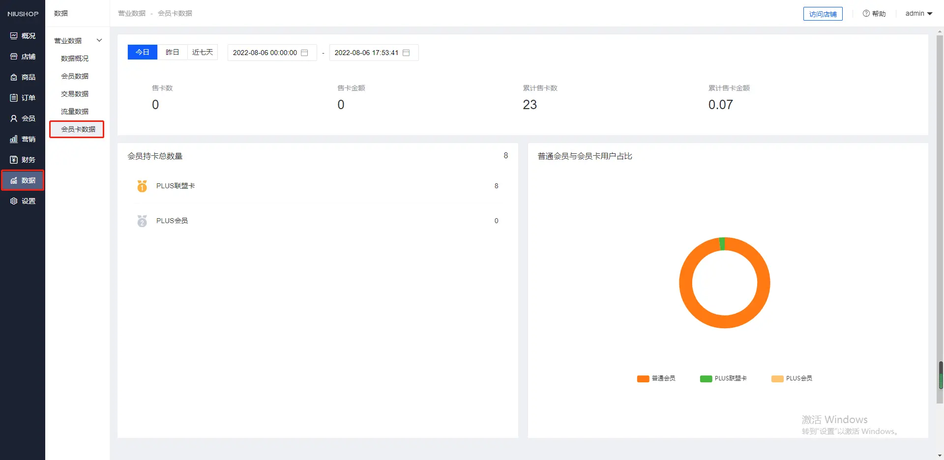 店铺统计在时间段内累计售卡数和售卡金额、会员持卡总数、普通会员和会员卡用户占比的趋势分析折线图等数据;
