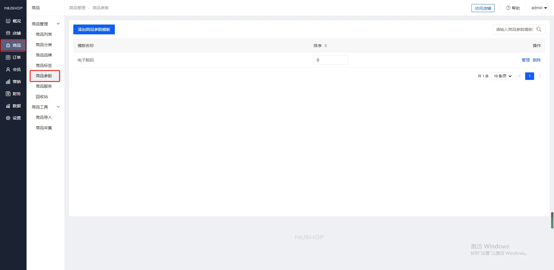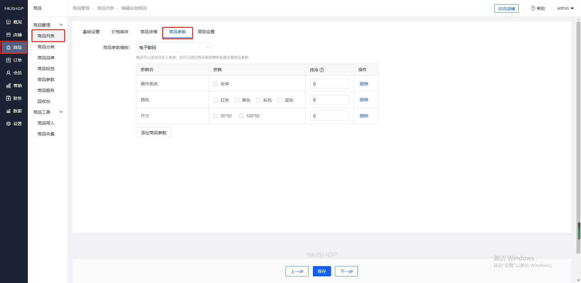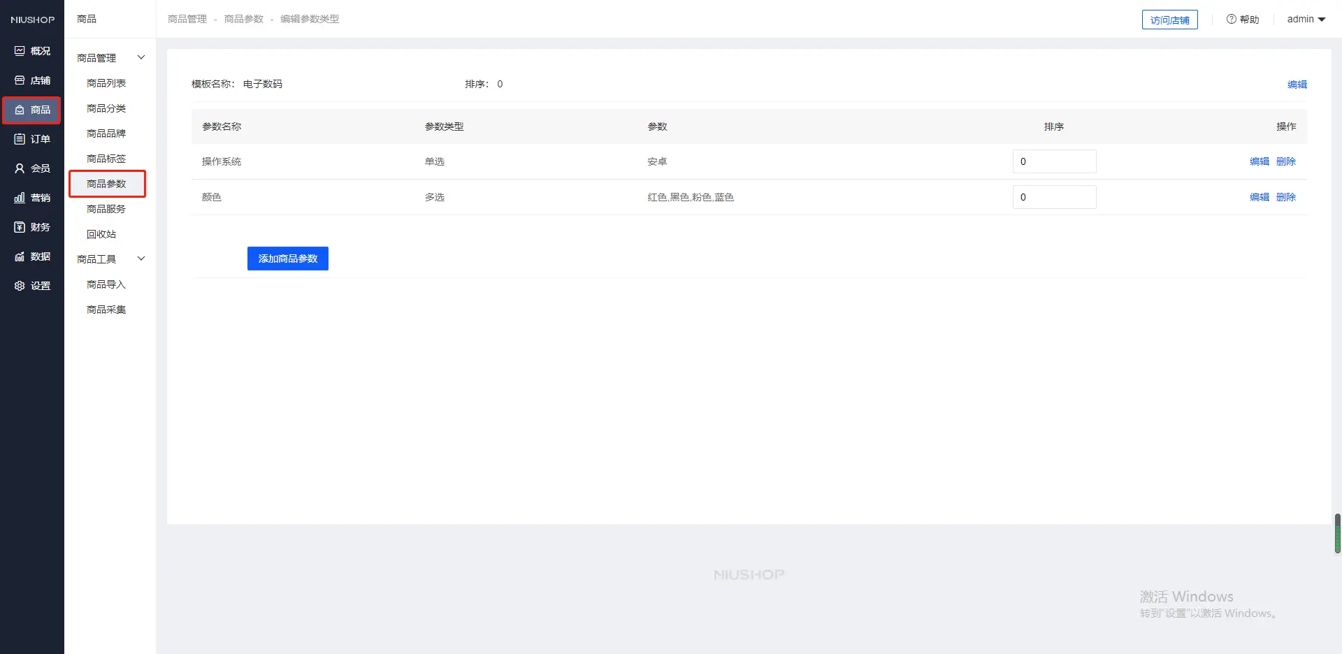 商品可以添加自定义参数,也可以通过商品参数模板批量设置商品参数