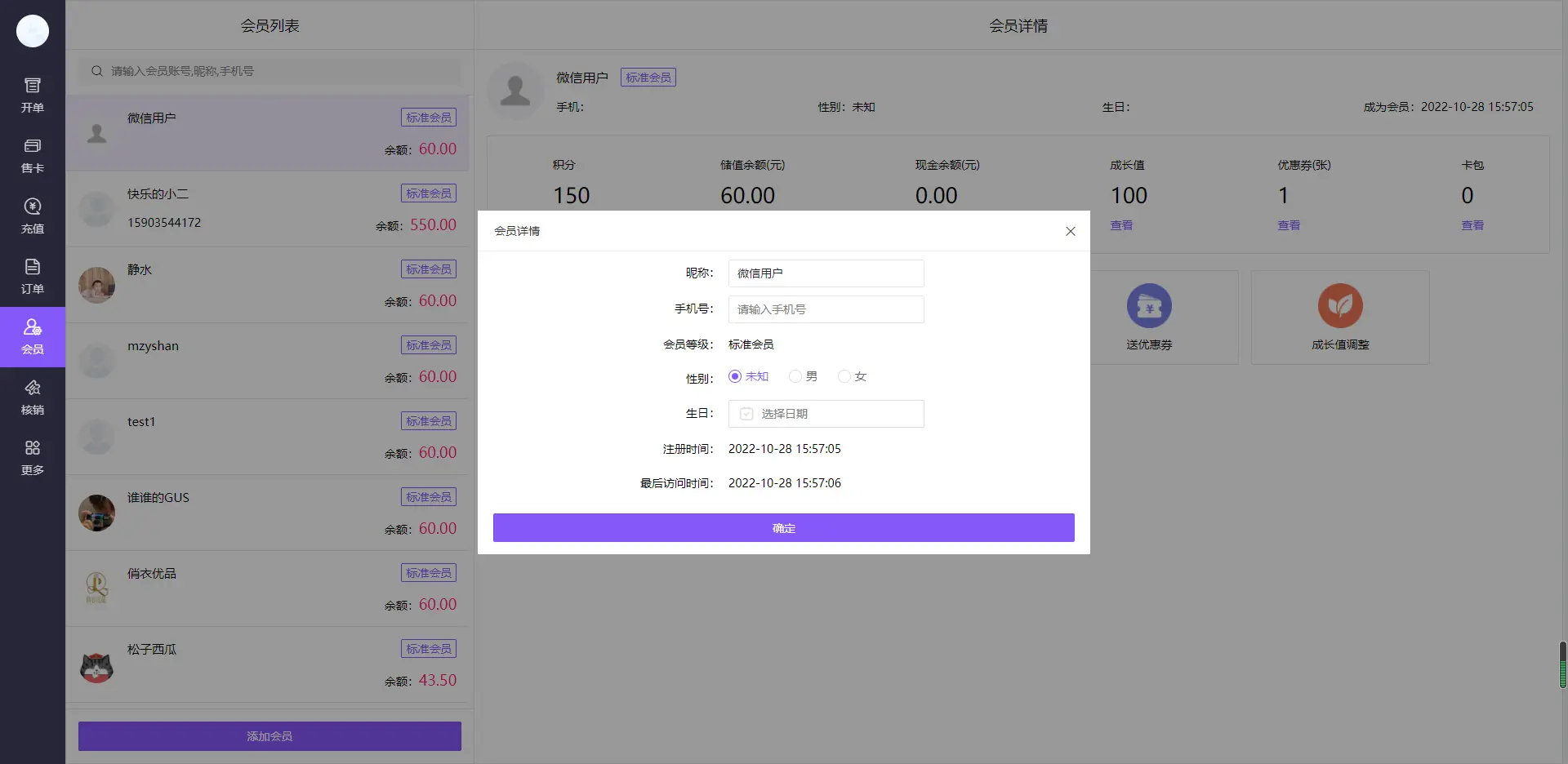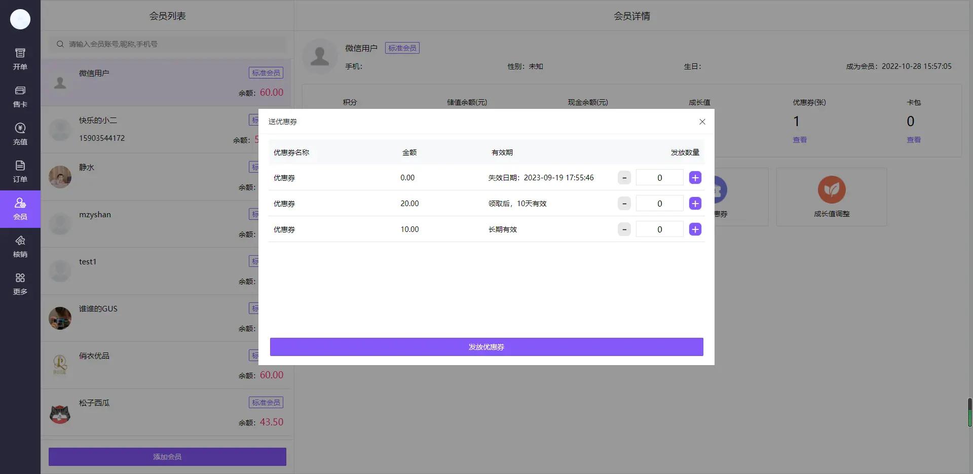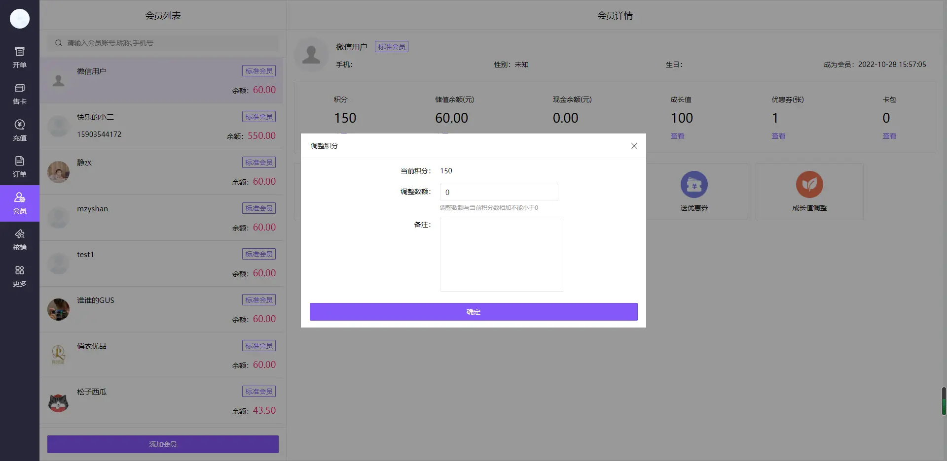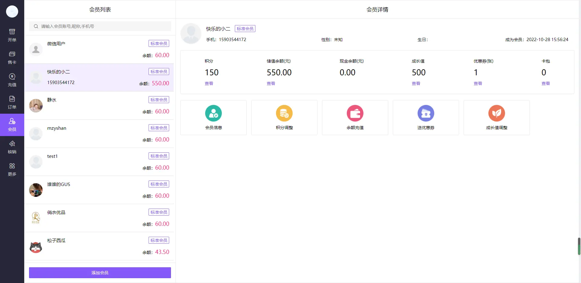 精细化的会员管理系统,包含调整会员余额、会员充值、会员成长值及送优惠券等功能。 一、会员列表 展示平台所有会员,可通过账号、昵称、手机号快速筛选 二、会员详情 点击查看会员详情,调整积分、成长值、充值、送优惠券等 积分调整 送优惠券 成长值调整
