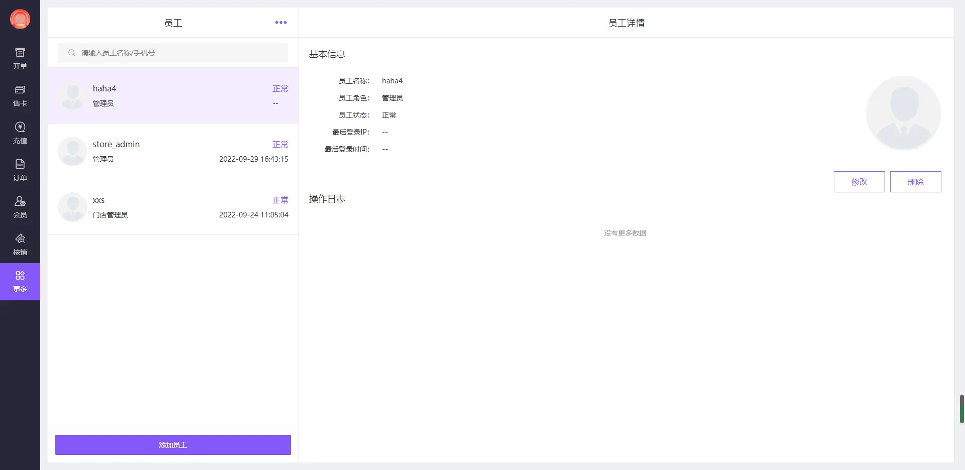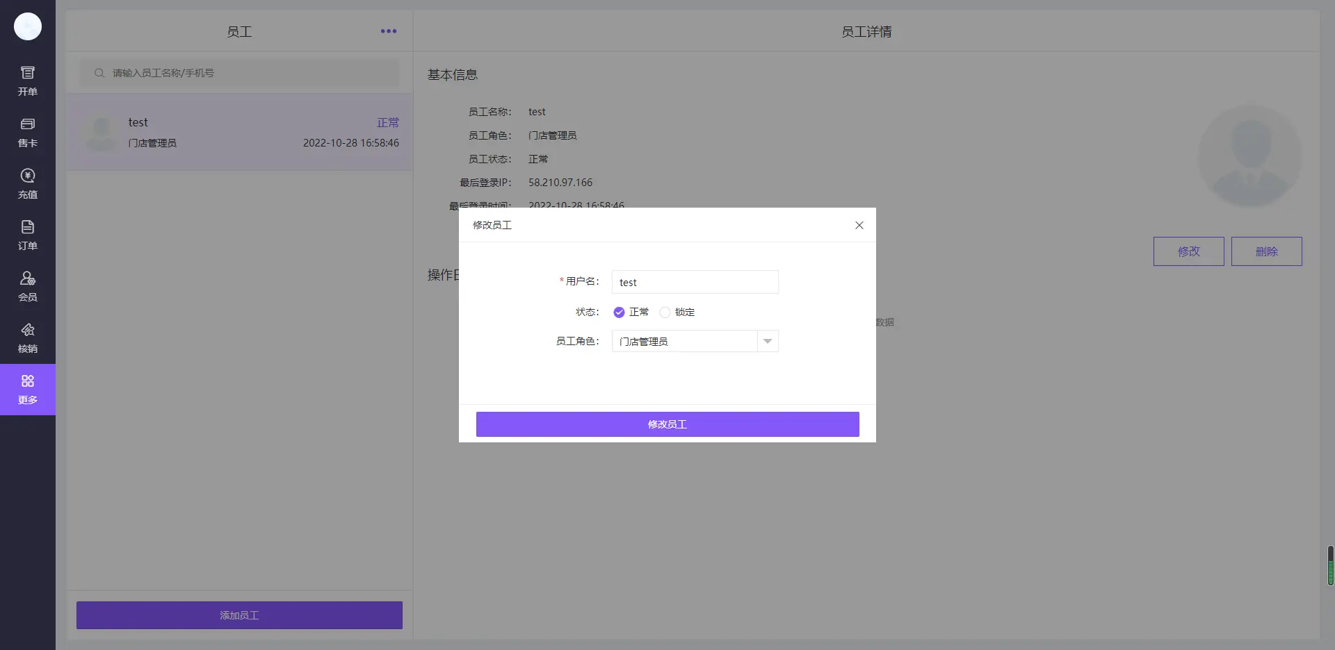 展示平台所有员工,点击查看员工详情,修改员工权限等,可通过员工名称、手机号快速筛选